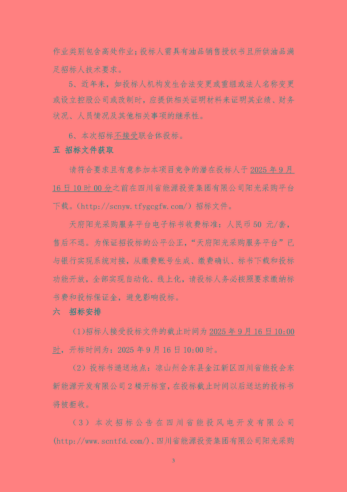 请符合要求且有意参加本项目竞争的潜在投标人于2025年9月16日10时00分之前在四川省能源投资集团有限公司阳光采购平台下载。(http://scnyw.tfygcgfw.com/)招标文件。