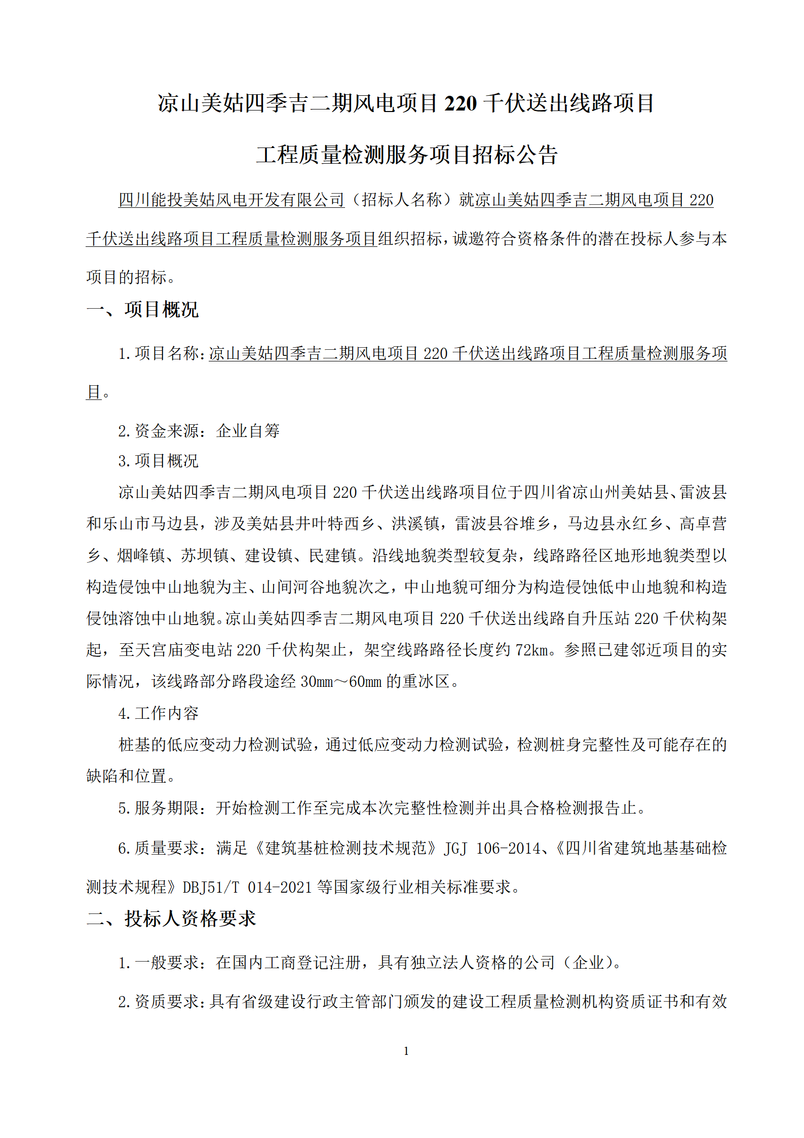 四川能投美姑风电开发有限公司(招标人名称)就凉山美姑四季吉二期风电项目220千伏送出线路项目工程质量检测服务项目组织招标,诚邀符合资格条件的潜在投标人参与本项目的招标。