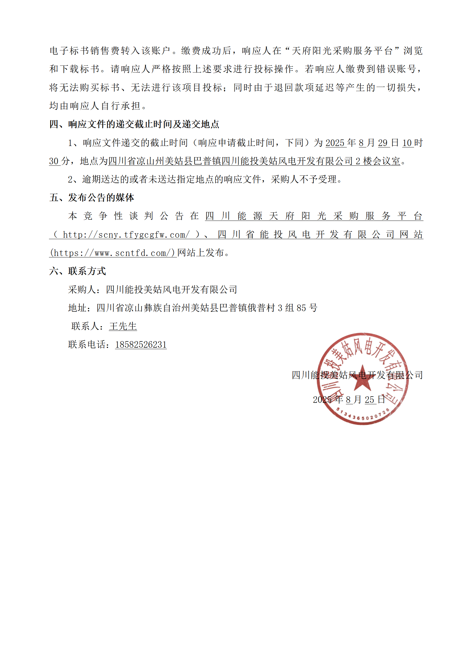1、响应文件递交的截止时间(响应申请截止时间,下同)为2025年8月29日10时30分,地点为四川省凉山州美姑县巴普镇四川能投美姑风电开发有限公司2楼会议室。