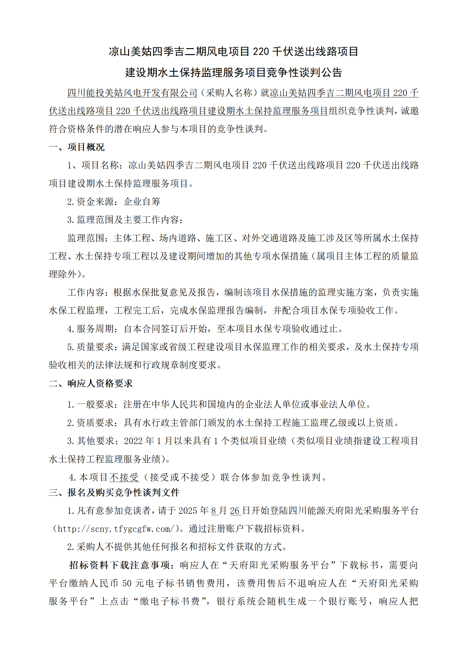 四川能投美姑风电开发有限公司(采购人名称)就凉山美姑四季吉二期风电项目220千伏送出线路项目220千伏送出线路项目建设期水土保持监理服务项目组织竞争性谈判,诚邀符合资格条件的潜在响应人参与本项目的竞争性谈判。