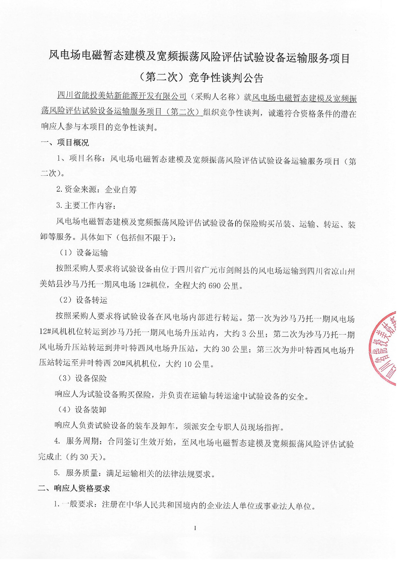 四川省能投美姑新能源开发有限公司(采购人名称)就风电场电磁暂态建模及宽频振荡风险评估试验设备运输服务项目(第二次)组织竞争性谈判,诚邀符合资格条件的潜在响应人参与本项目的竞争性谈判。