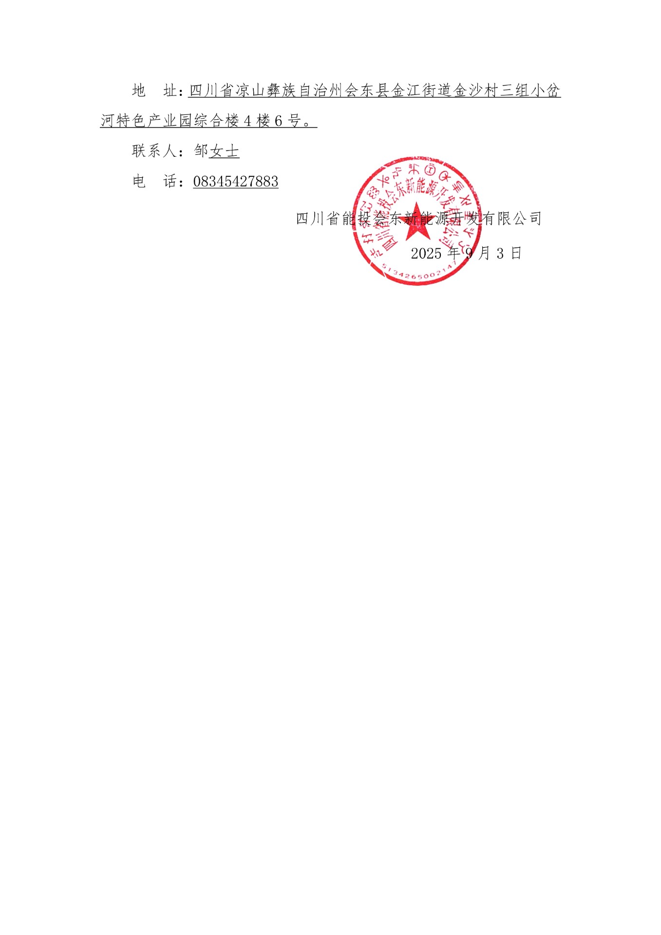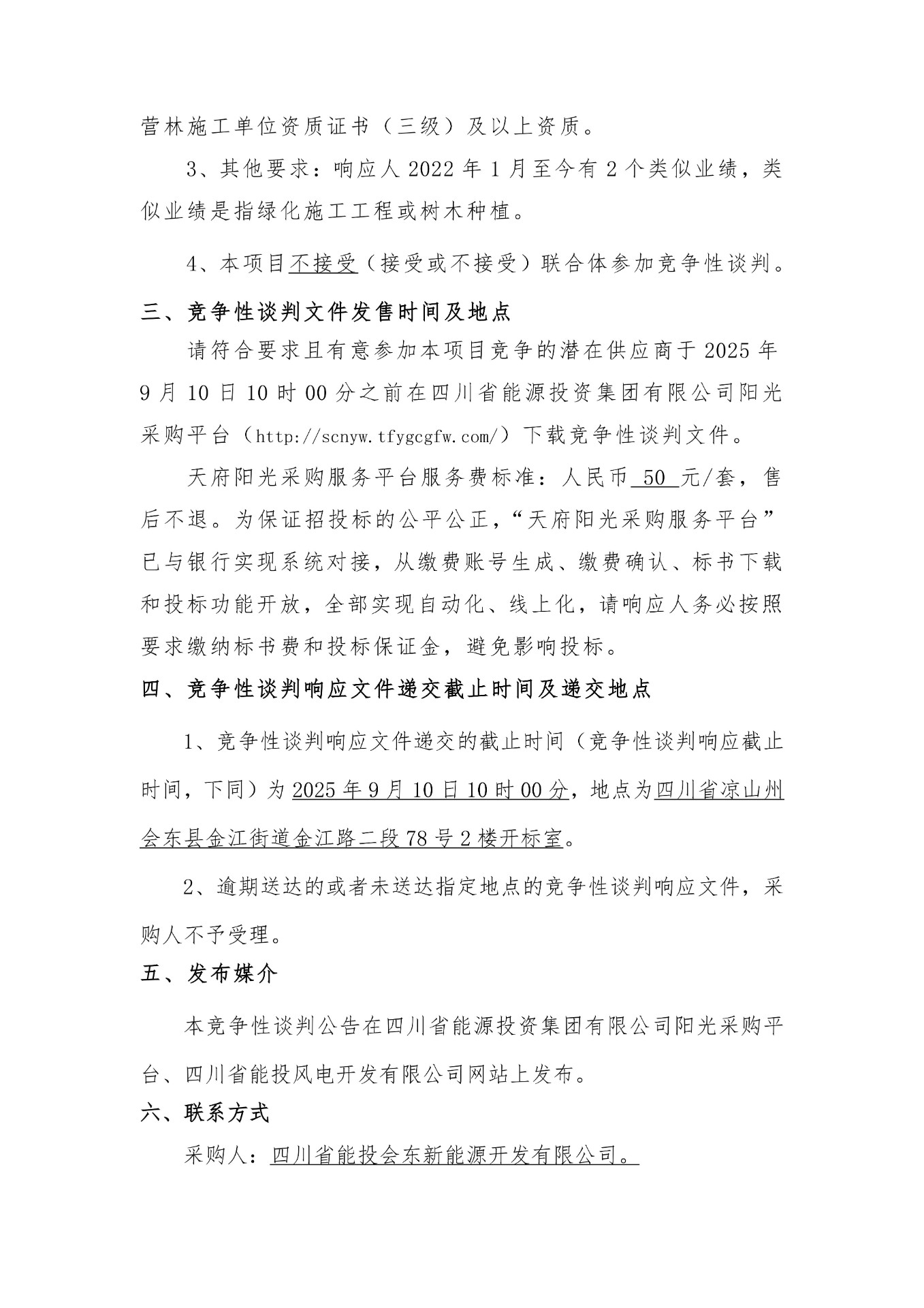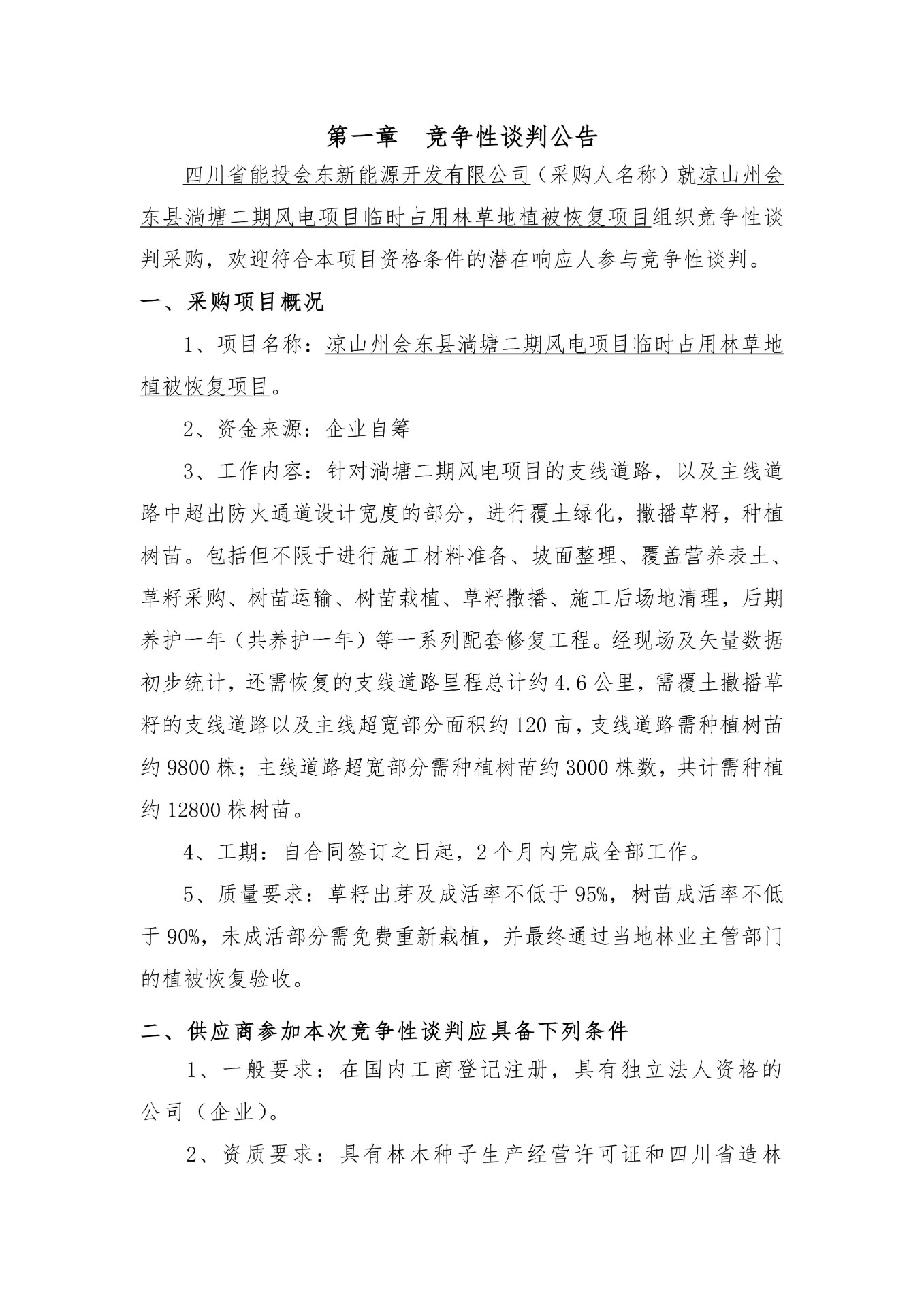 四川省能投会东新能源开发有限公司(采购人名称)就凉山州会东县淌塘二期风电项目临时占用林草地植被恢复项目组织竞争性谈判采购,欢迎符合本项目资格条件的潜在响应人参与竞争性谈判。