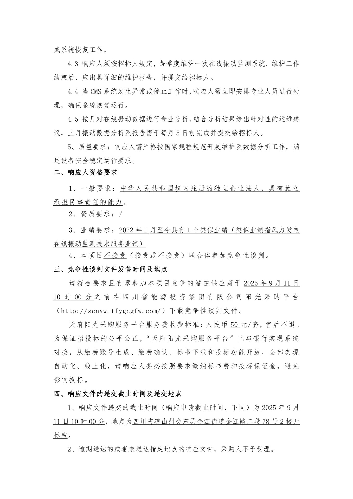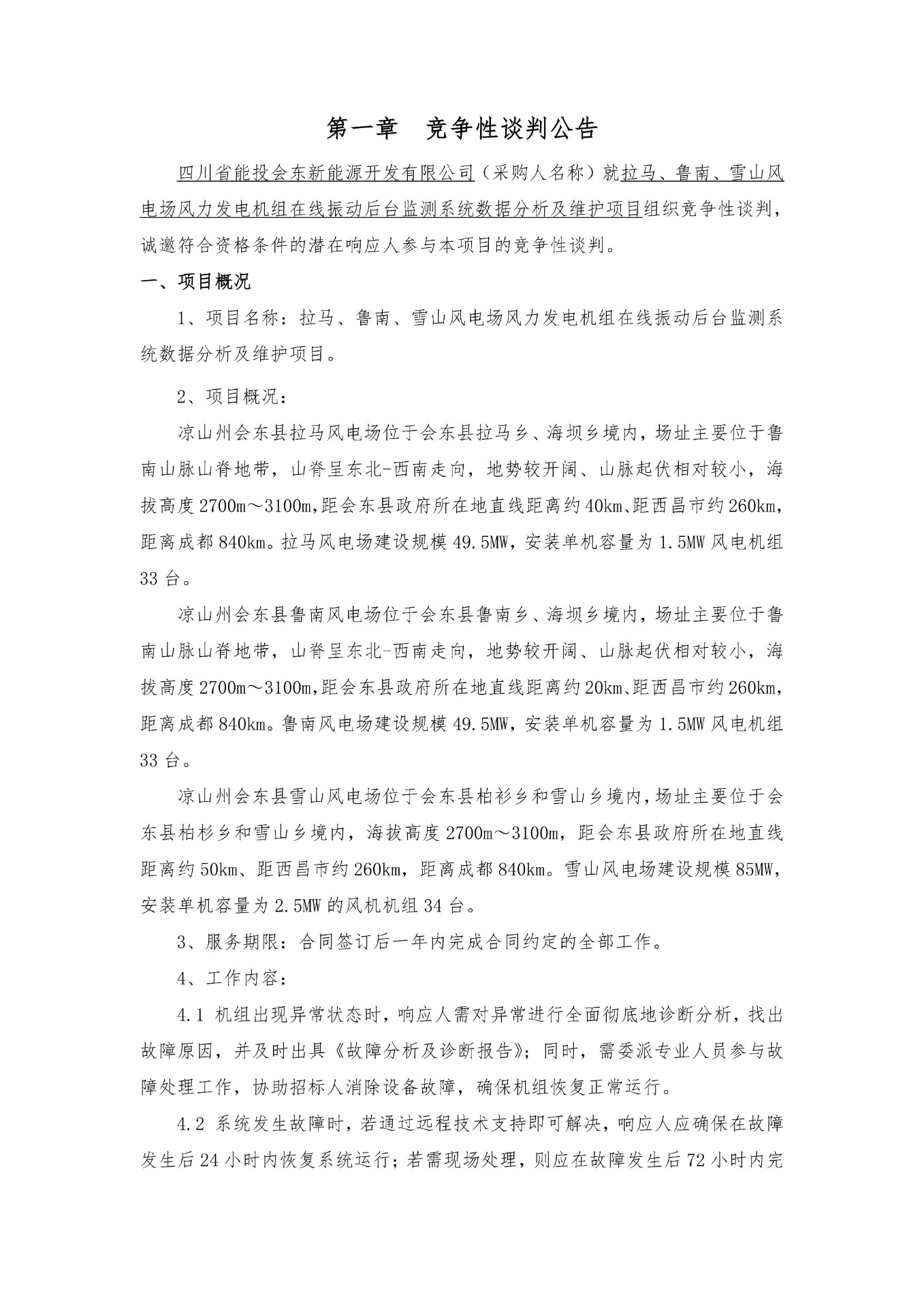 四川省能投会东新能源开发有限公司(采购人名称)就拉马、鲁南、雪山风电场风力发电机组在线振动后台监测系统数据分析及维护项目组织竞争性谈判,诚邀符合资格条件的潜在响应人参与本项目的竞争性谈判。