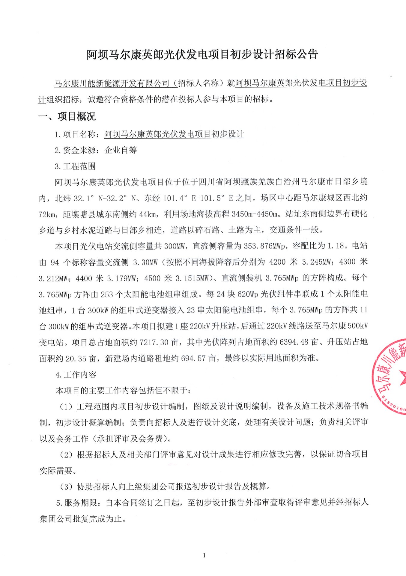 马尔康川能新能源开发有限公司(招标人名称)就阿坝马尔康英郎光伏发电项目初步设计组织招标,诚邀符合资格条件的潜在投标人参与本项目的招标。