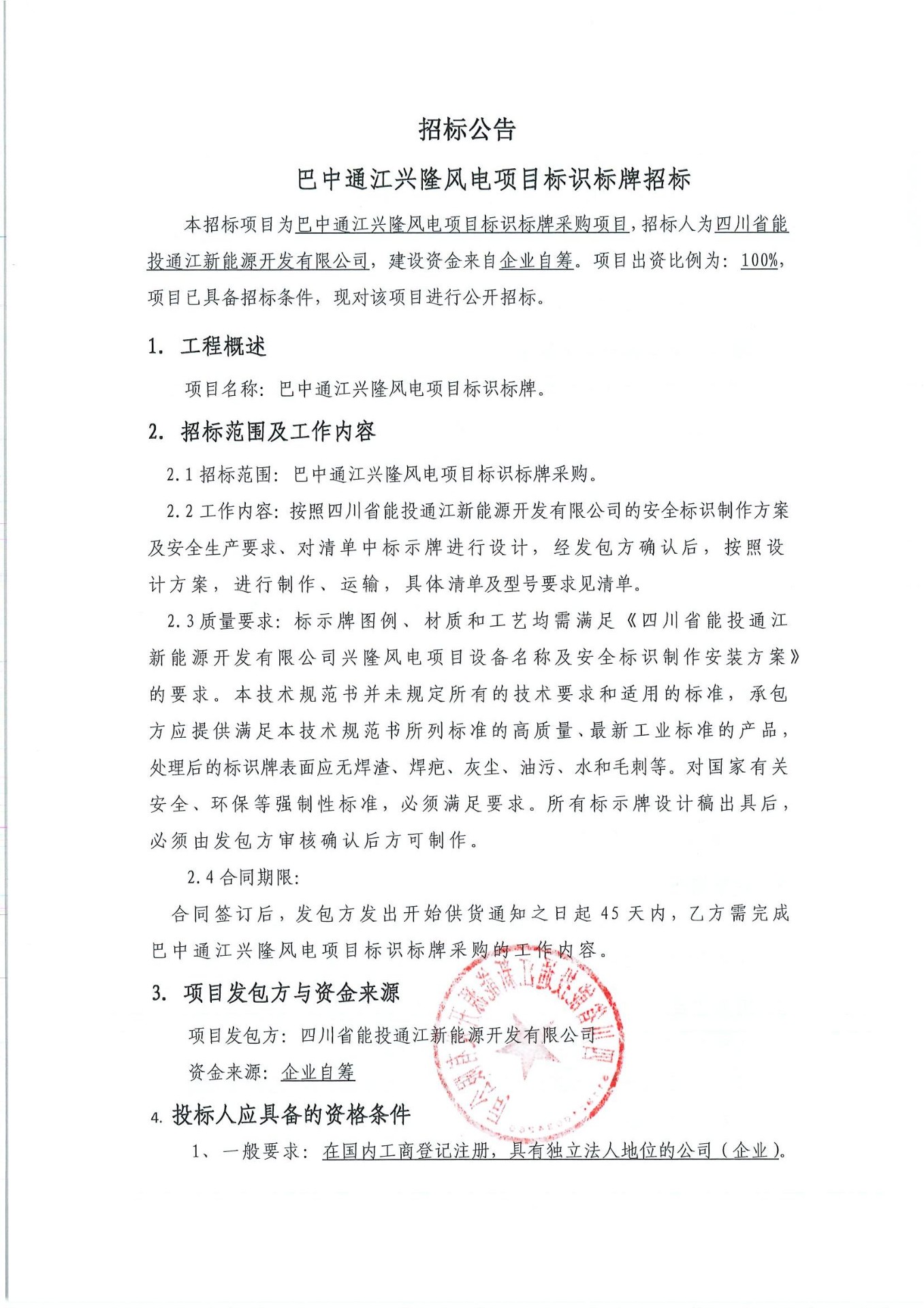 本招标项目为巴中通江兴隆风电项目标识标牌采购项目,招标人为四川省能投通江新能源开发有限公司,建设资金来自企业自筹。项目出资比例为:100%,项目已具备招标条件,现对该项目进行公开招标。
