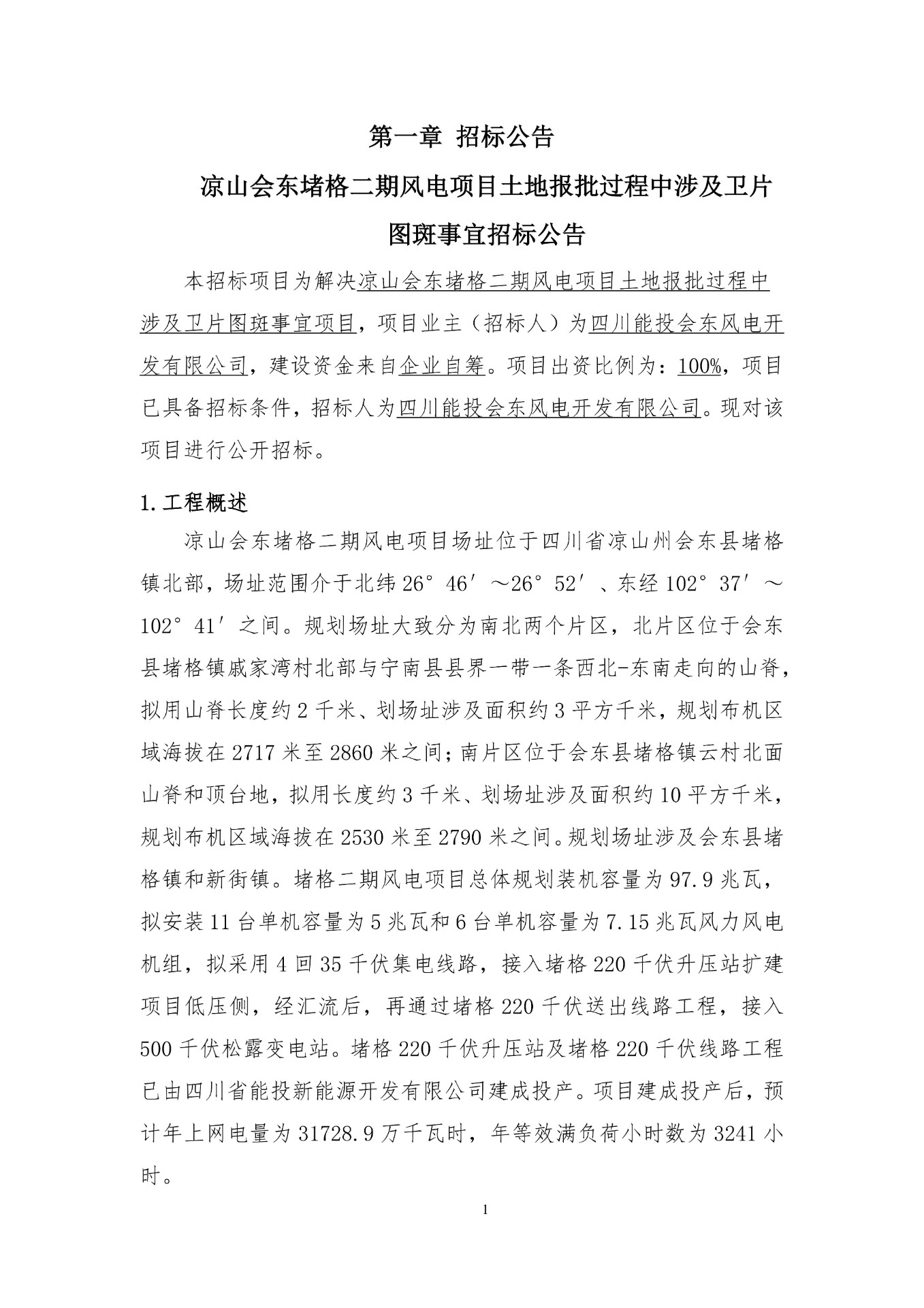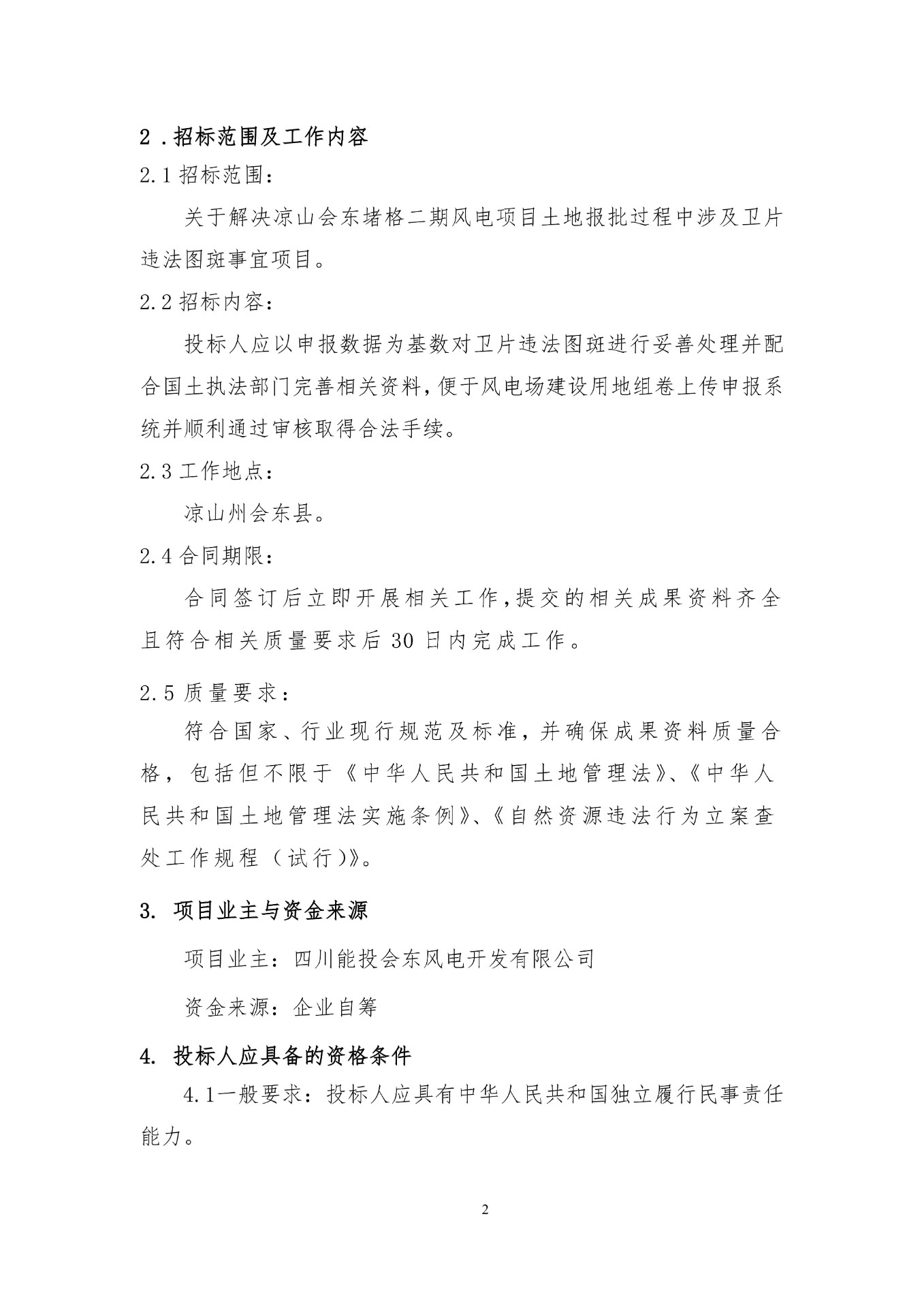 本招标项目为解决凉山会东堵格二期风电项目土地报批过程中涉及卫片图斑事宜项目,项目业主(招标人)为四川能投会东风电开发有限公司,建设资金来自企业自筹。项目出资比例为:100%,项目已具备招标条件,招标人为四川能投会东风电开发有限公司。现对该项目进行公开招标。