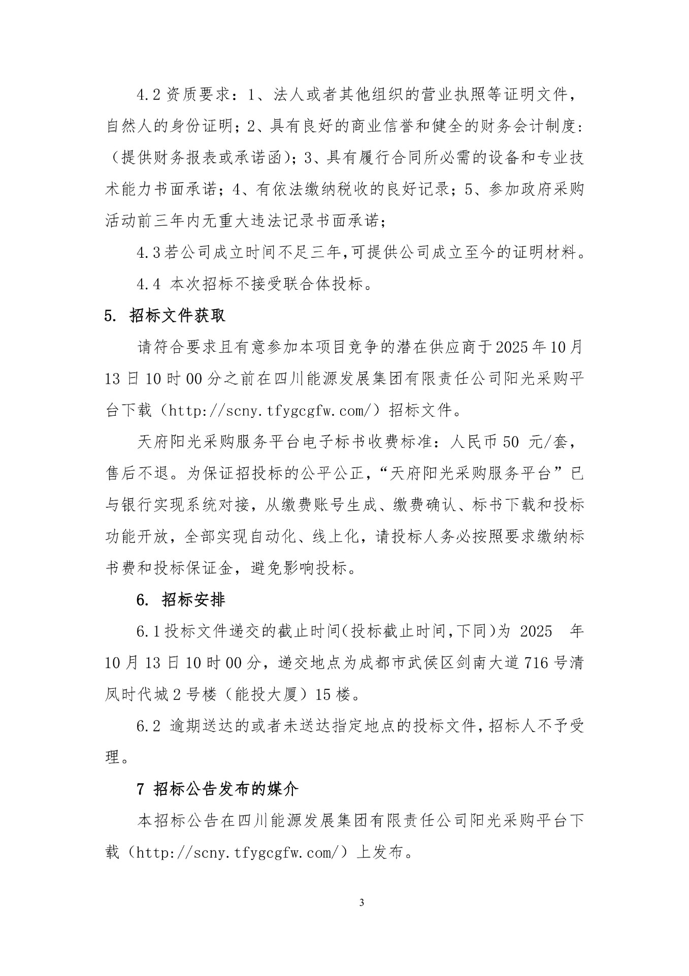 6.1投标文件递交的截止时间(投标截止时间,下同)为 2025 年10月13日10时00分,递交地点为成都市武侯区剑南大道716号清凤时代城2号楼(能投大厦)15楼。