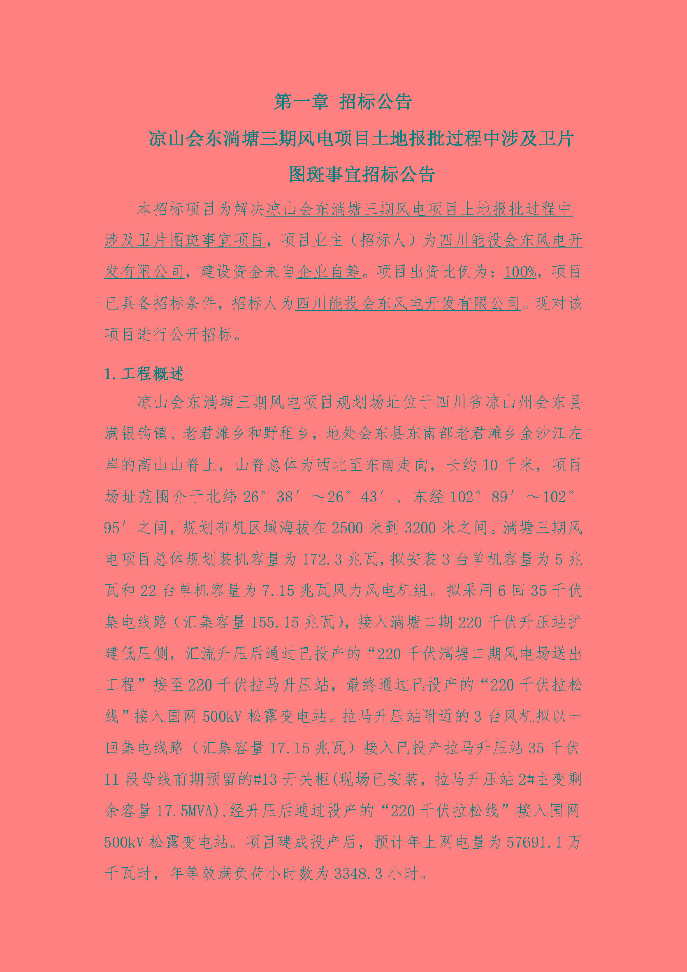 本招标项目为解决凉山会东淌塘三期风电项目土地报批过程中涉及卫片图斑事宜项目,项目业主(招标人)为四川能投会东风电开发有限公司,建设资金来自企业自筹。项目出资比例为:100%,项目已具备招标条件,招标人为四川能投会东风电开发有限公司。现对该项目进行公开招标。
