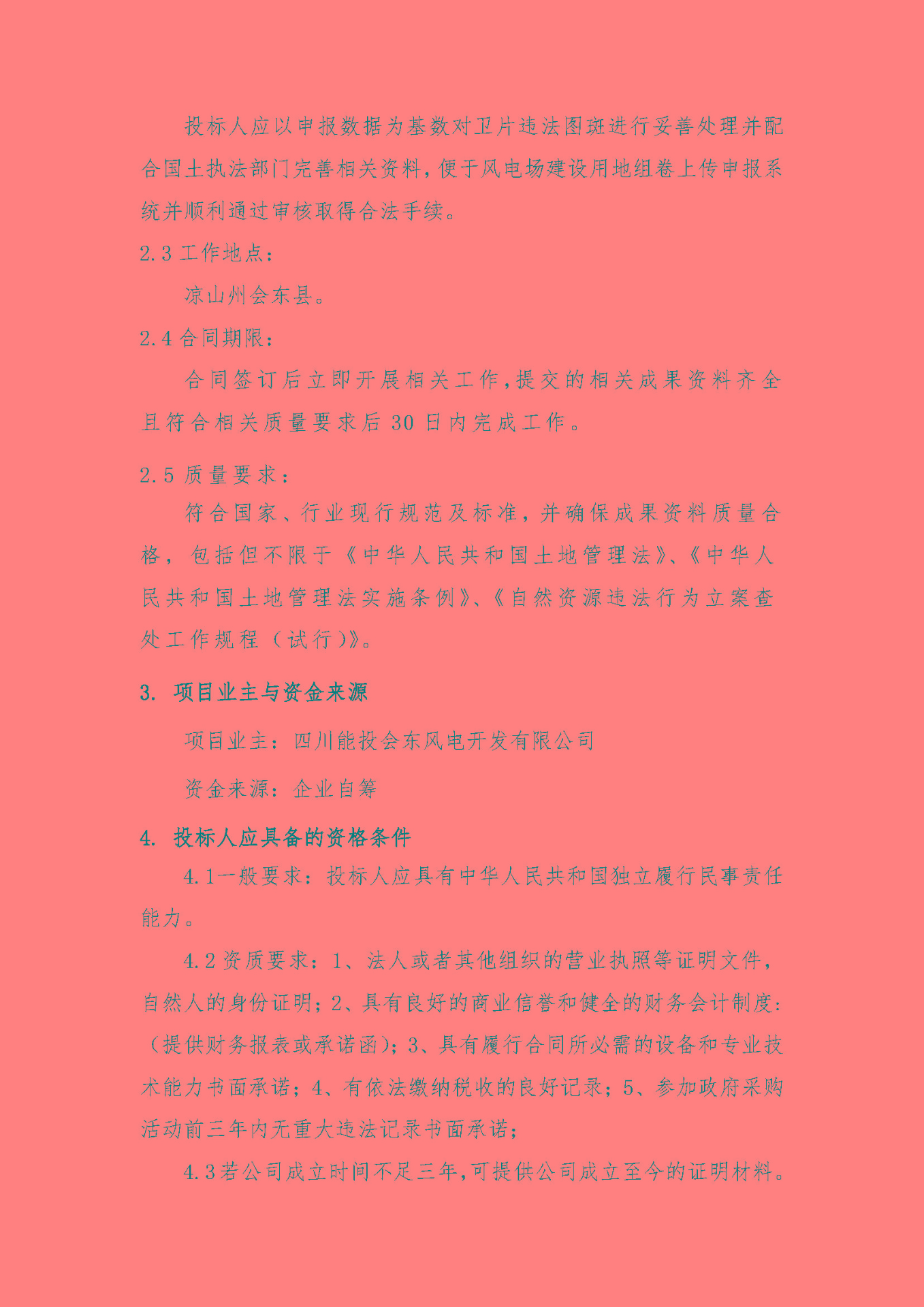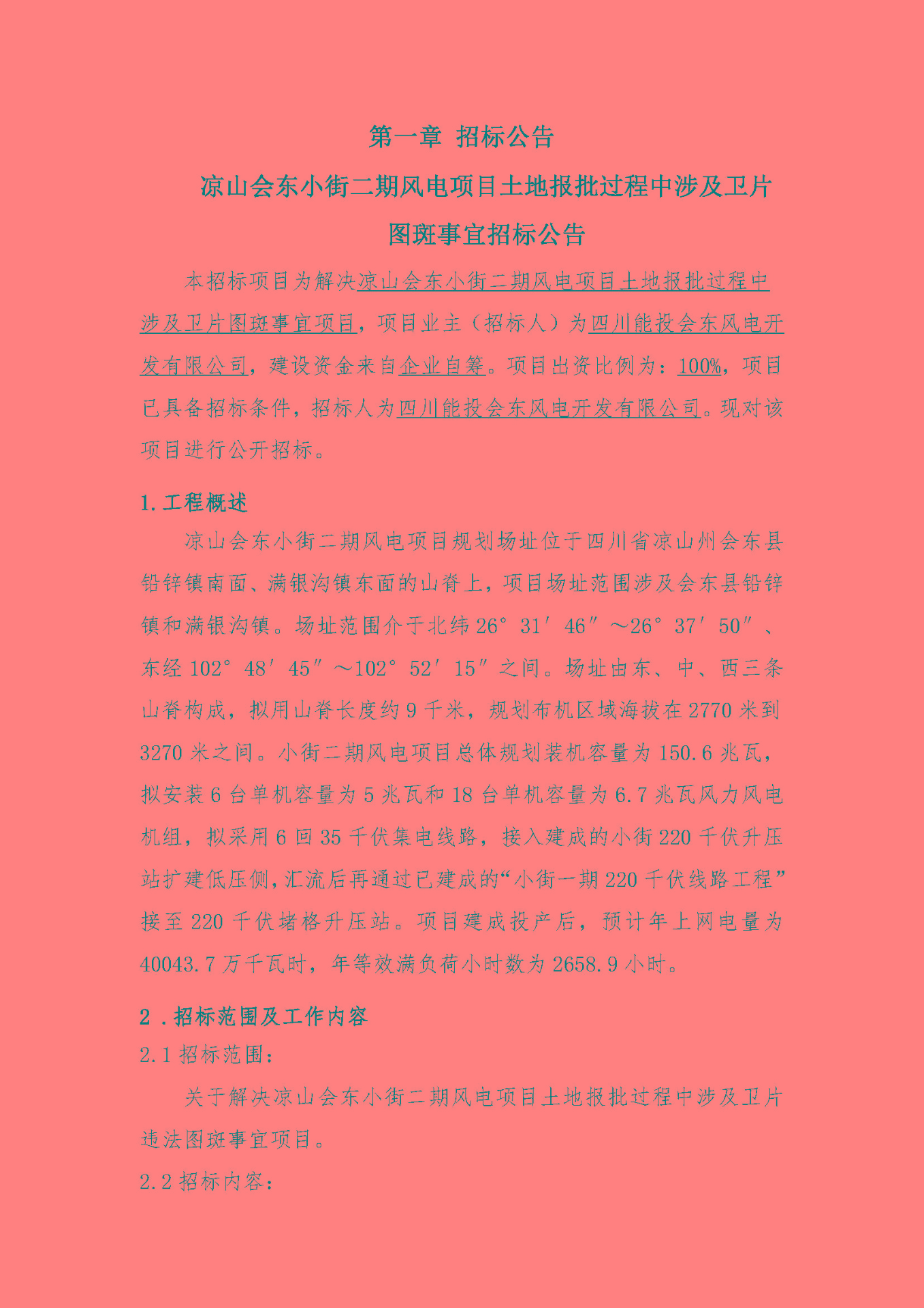 本招标项目为解决凉山会东小街二期风电项目土地报批过程中涉及卫片图斑事宜项目,项目业主(招标人)为四川能投会东风电开发有限公司,建设资金来自企业自筹。项目出资比例为:100%,项目已具备招标条件,招标人为四川能投会东风电开发有限公司。现对该项目进行公开招标。