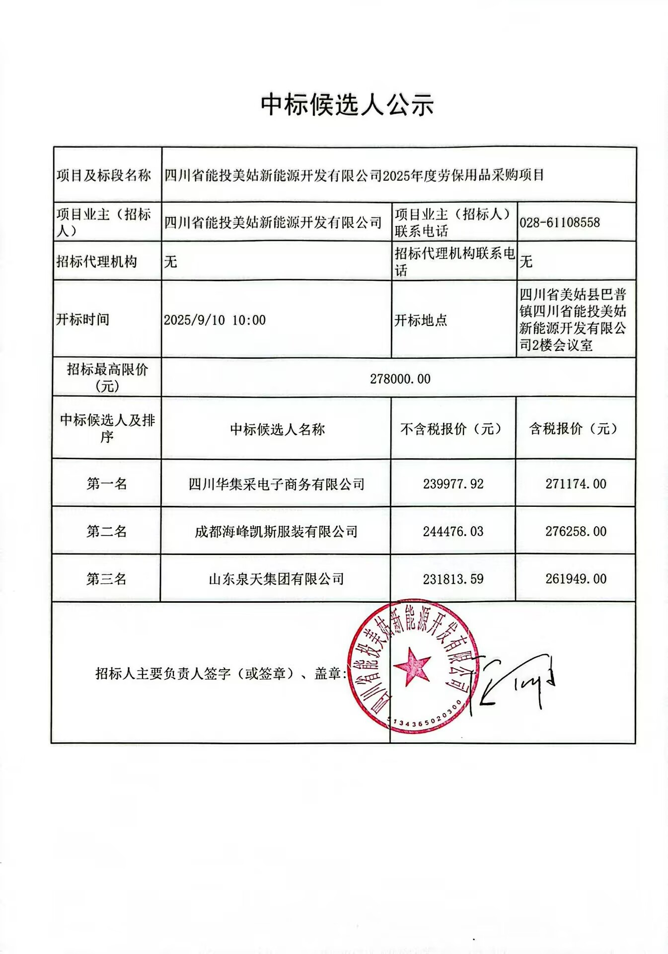 四川省能投美姑新能源开发有限公司关于2025年度劳保用品采购项目的中标候选人公示