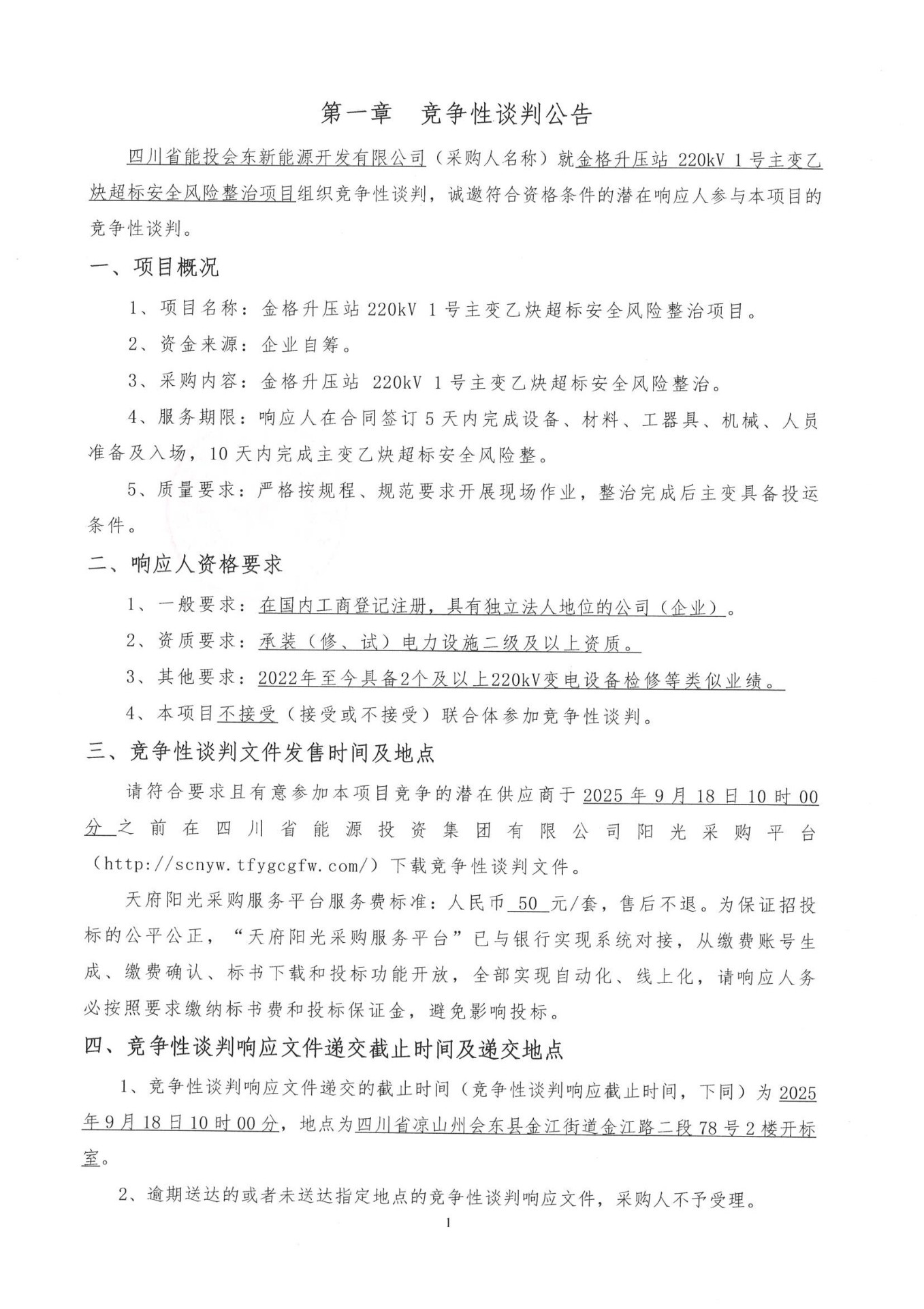 四川省能投会东新能源开发有限公司(采购人名称)就金格升压站 220kV 1号主变乙炔超标安全风险整治项目组织竞争性谈判,诚邀符合资格条件的潜在响应人参与本项目的竞争性谈判。