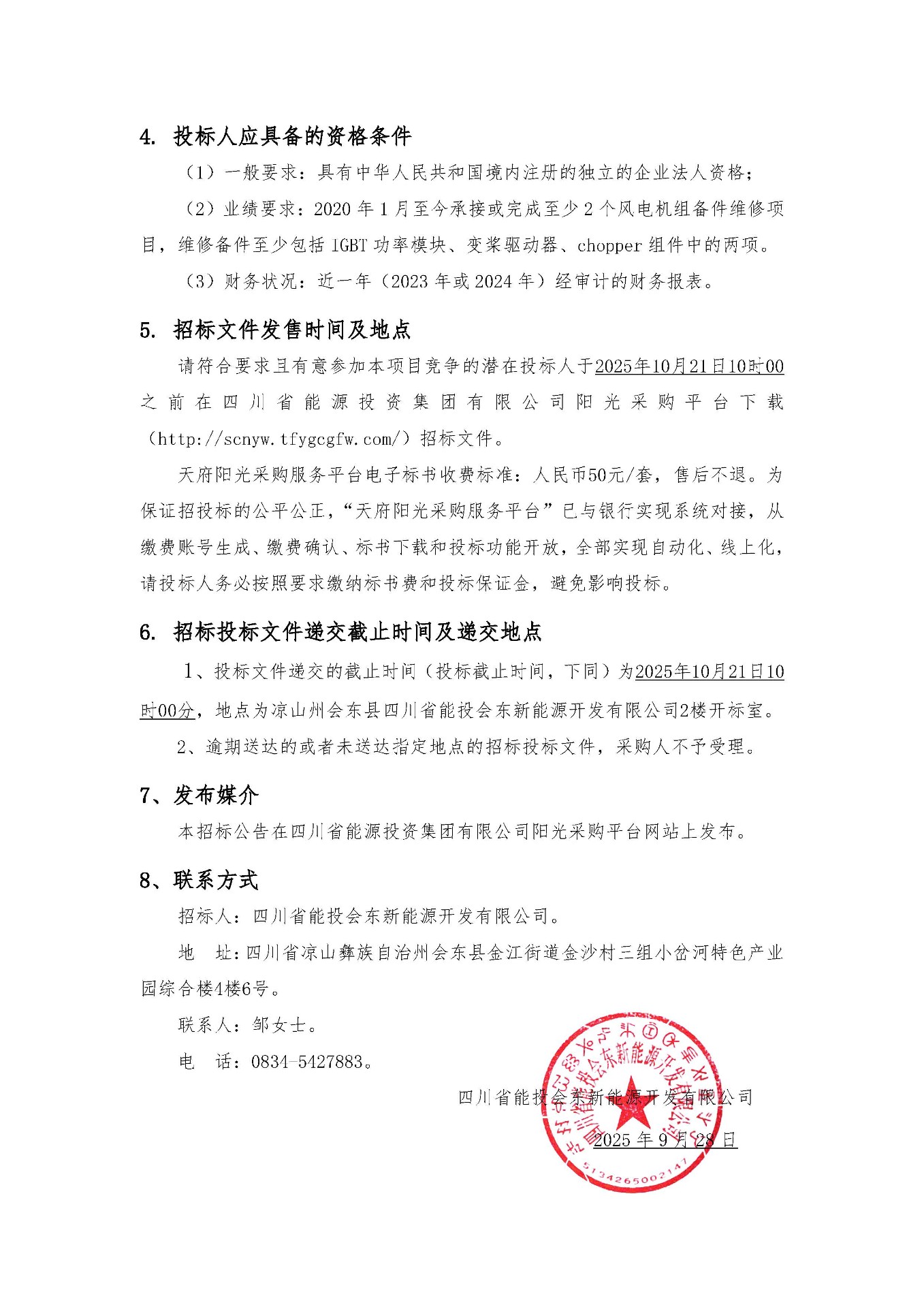 1、投标文件递交的截止时间(投标截止时间,下同)为2025年10月21日10时00分,地点为凉山州会东县四川省能投会东新能源开发有限公司2楼开标室。