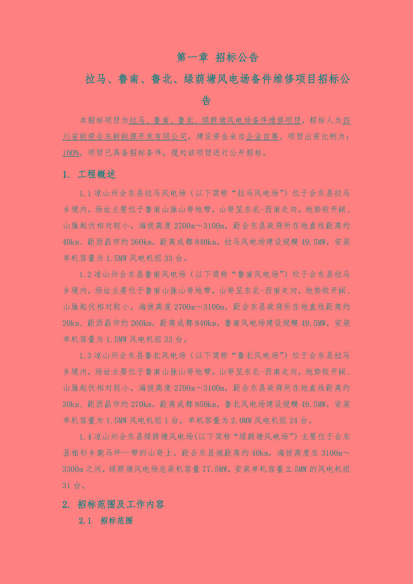 本招标项目为拉马、鲁南、鲁北、绿荫塘风电场备件维修项目,招标人为四川省能投会东新能源开发有限公司,建设资金来自企业自筹。项目出资比例为:100%,项目已具备招标条件,现对该项目进行公开招标。