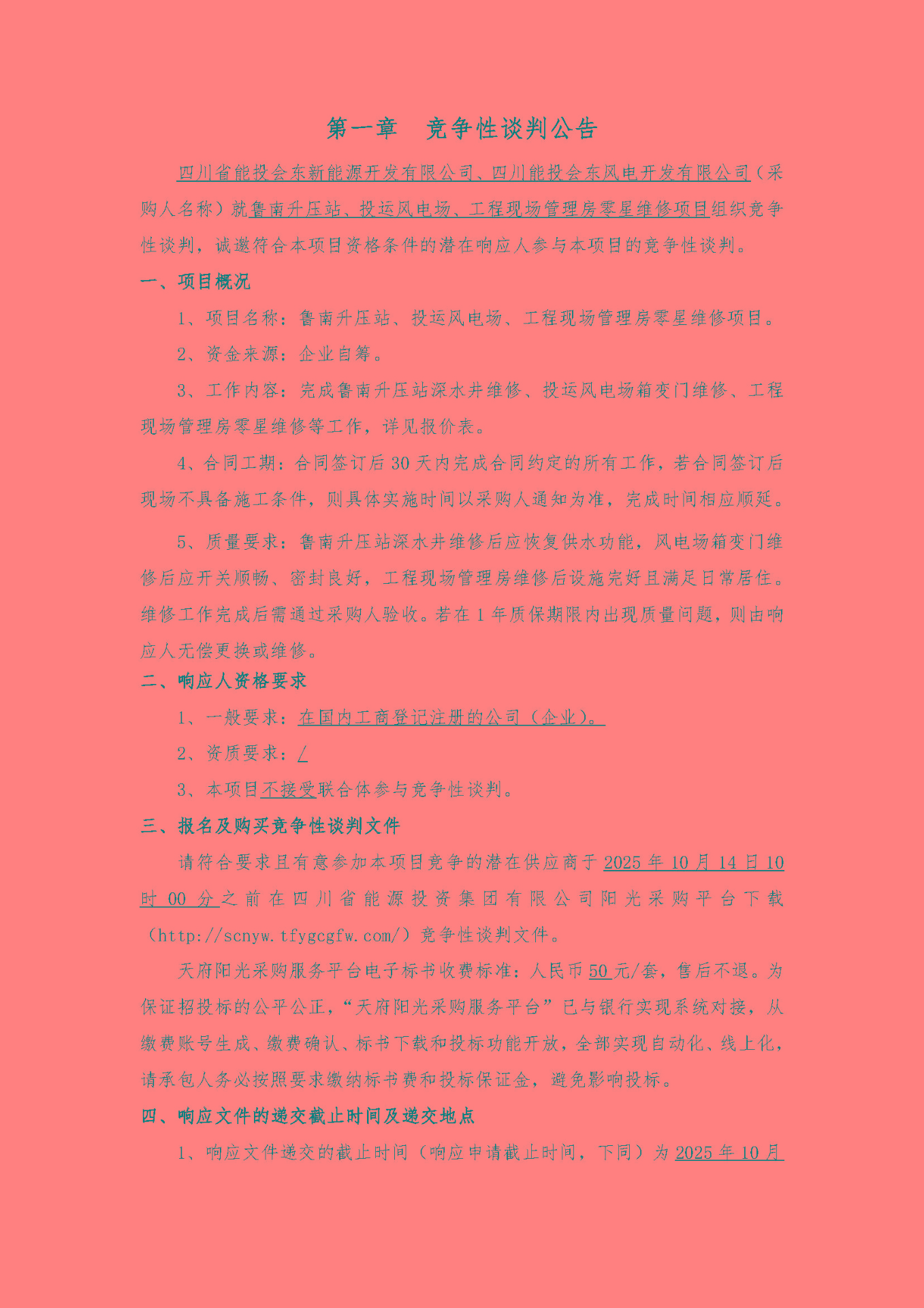 四川省能投会东新能源开发有限公司、四川能投会东风电开发有限公司(采购人名称)就鲁南升压站、投运风电场、工程现场管理房零星维修项目组织竞争性谈判,诚邀符合本项目资格条件的潜在响应人参与本项目的竞争性谈判。