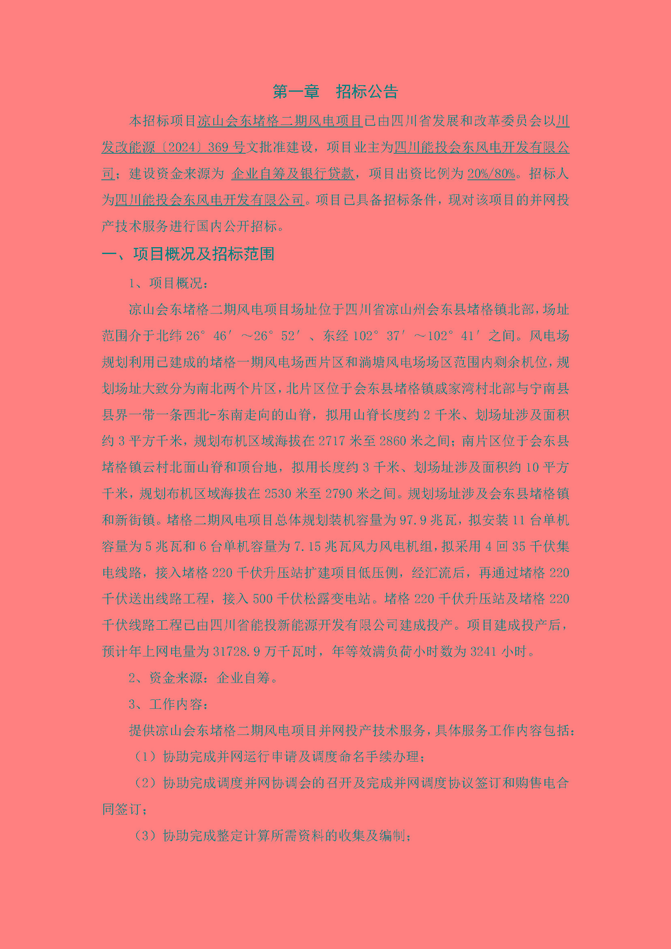 本招标项目凉山会东堵格二期风电项目已由四川省发展和改革委员会以川发改能源〔2024〕369号文批准建设,项目业主为四川能投会东风电开发有限公司;建设资金来源为 企业自筹及银行贷款,项目出资比例为20%/80%。招标人为四川能投会东风电开发有限公司。项目已具备招标条件,现对该项目的并网投产技术服务进行国内公开招标。