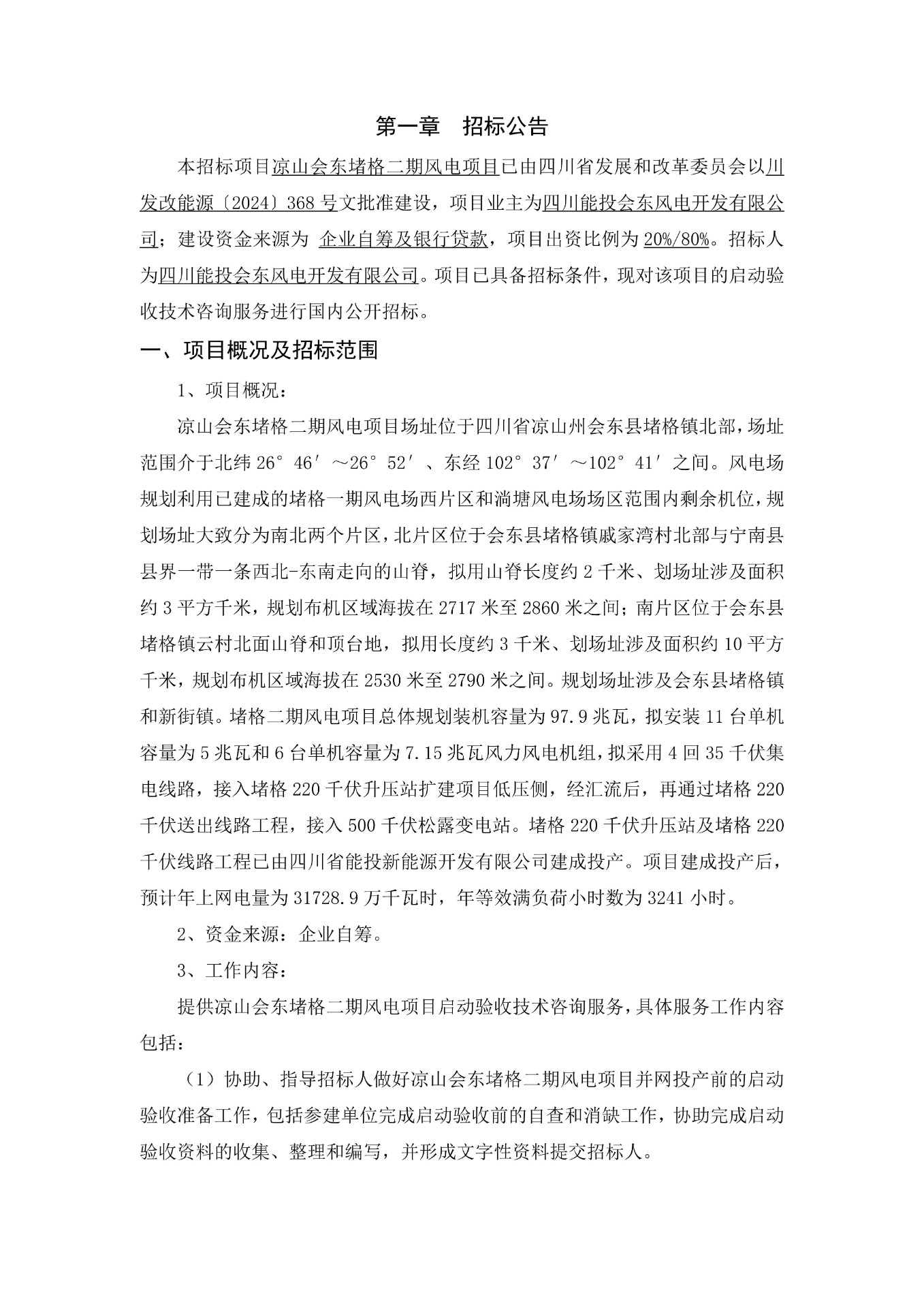 本招标项目凉山会东堵格二期风电项目已由四川省发展和改革委员会以川发改能源〔2024〕368号文批准建设,项目业主为四川能投会东风电开发有限公司;建设资金来源为 企业自筹及银行贷款,项目出资比例为20%/80%。招标人为四川能投会东风电开发有限公司。项目已具备招标条件,现对该项目的启动验收技术咨询服务进行国内公开招标。