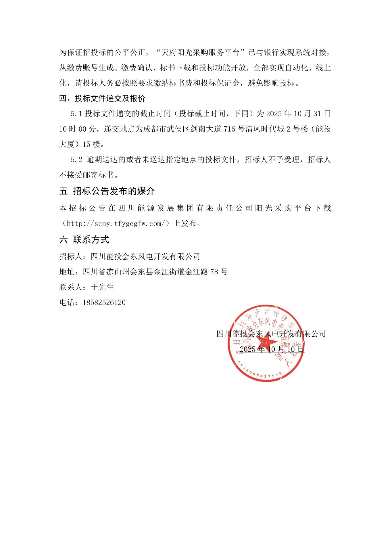 5.1投标文件递交的截止时间(投标截止时间,下同)为2025年10月31日10时00分,递交地点为成都市武侯区剑南大道716号清凤时代城2号楼(能投大厦)15楼。