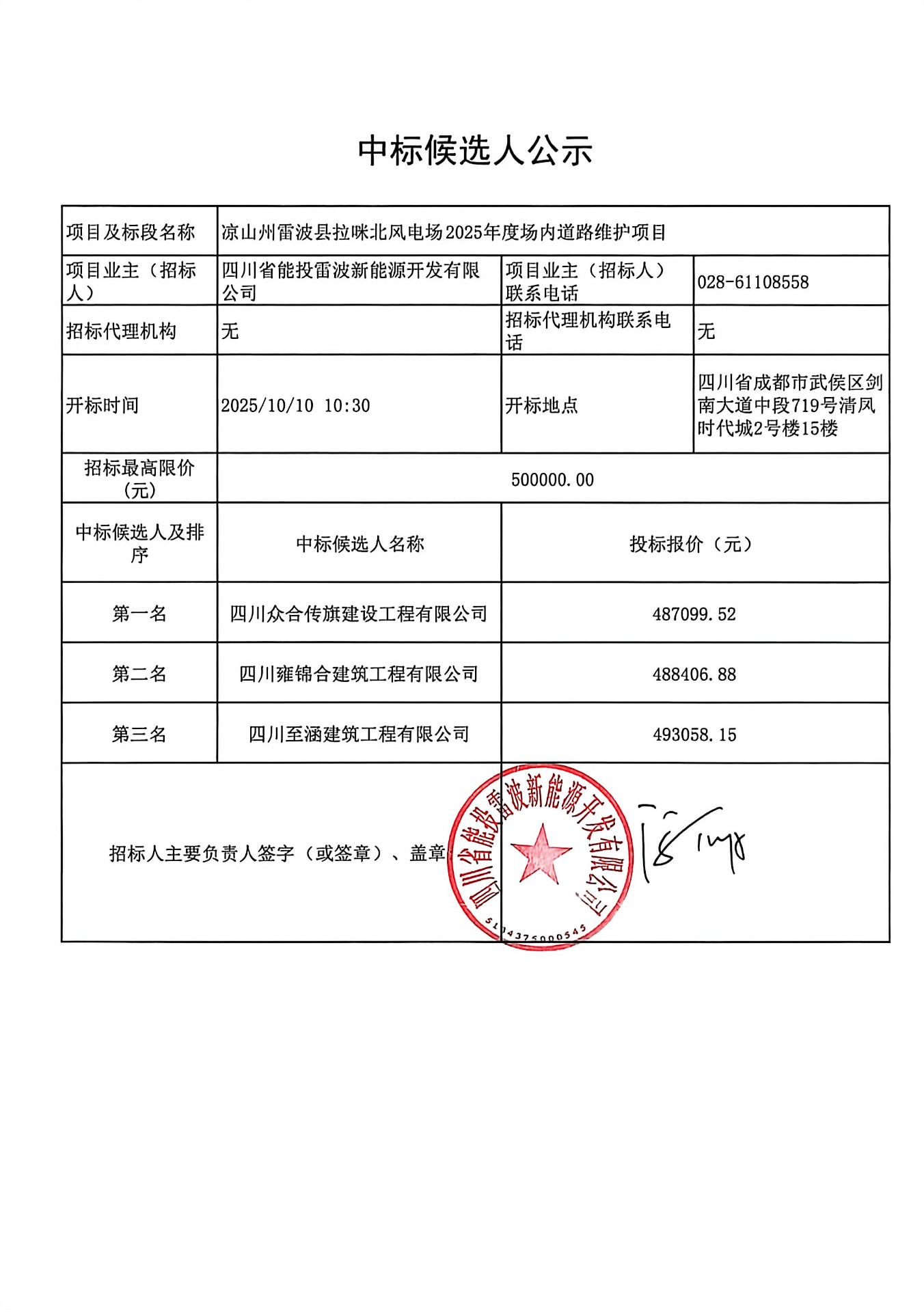 上一条:四川能投美姑风电开发有限公司关于乐西高速中铁十八局施工便道改扩建施工项目的中标候选人公示