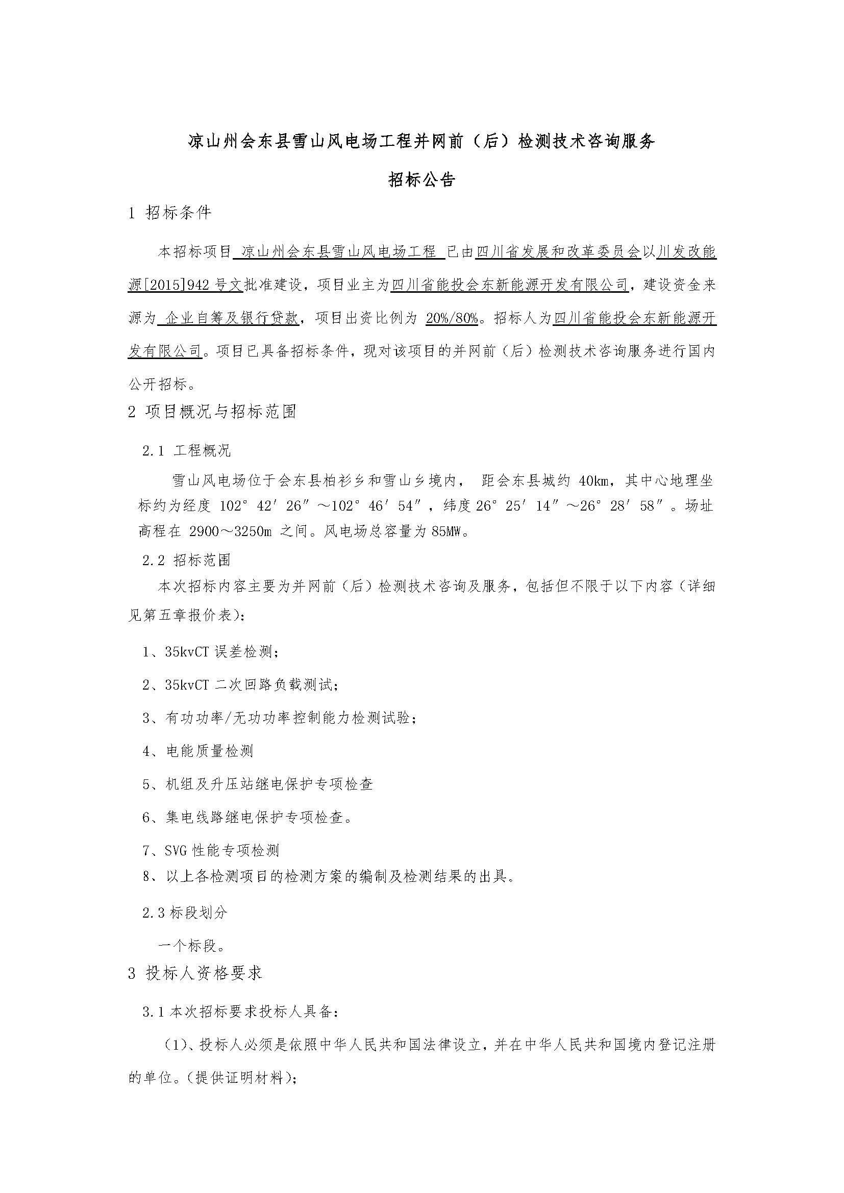 本招标项目 凉山州会东县雪山风电场工程 已由四川省发展和改革委员会以川发改能源[2015]942号文批准建设,项目业主为四川省能投会东新能源开发有限公司,建设资金来源为 企业自筹及银行贷款,项目出资比例为20%/80%。招标人为四川省能投会东新能源开发有限公司。项目已具备招标条件,现对该项目的并网前(后)检测技术咨询服务进行国内公开招标。