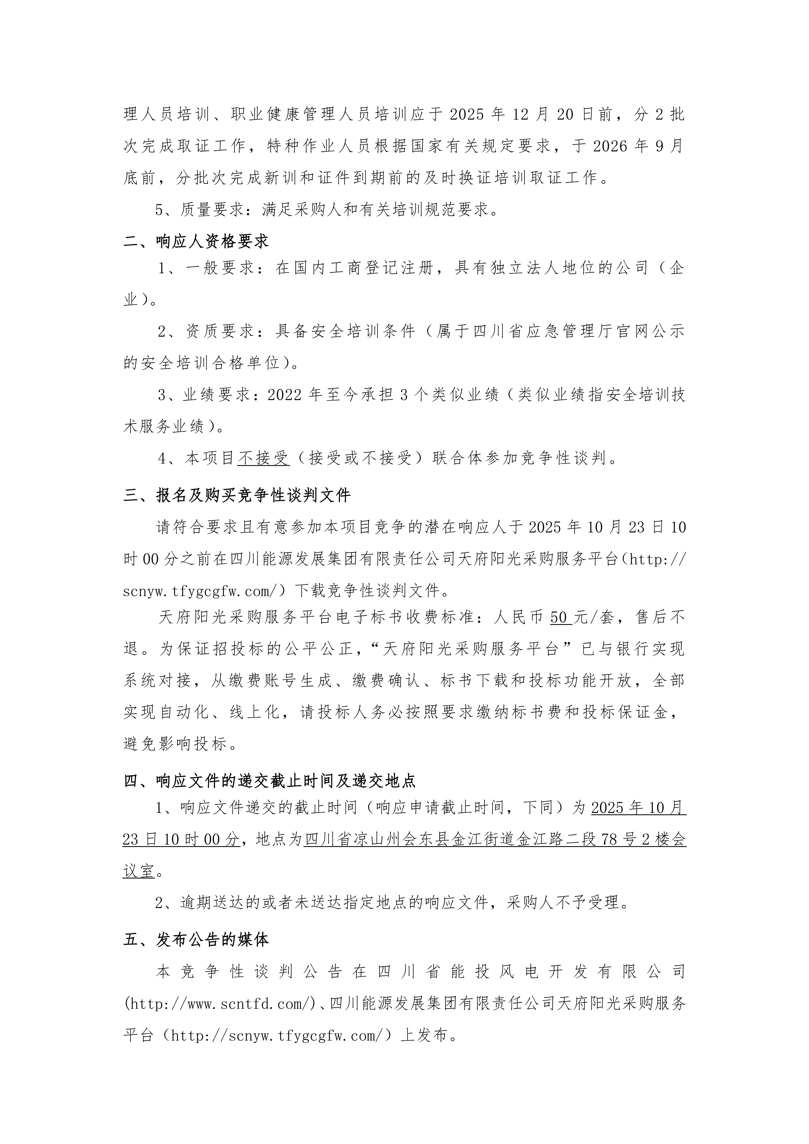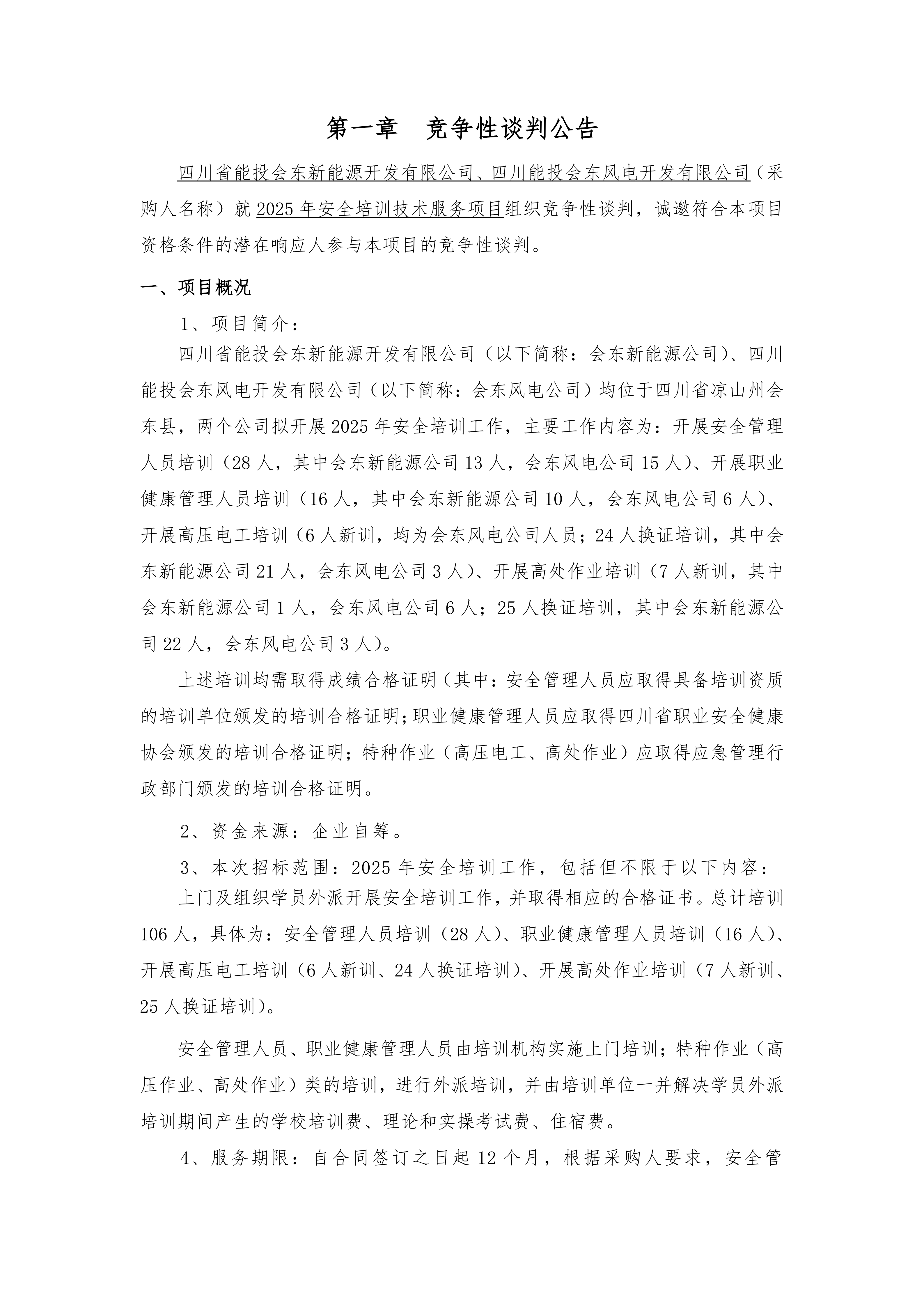 四川省能投会东新能源开发有限公司、四川能投会东风电开发有限公司(采购人名称)就2025年安全培训技术服务项目组织竞争性谈判,诚邀符合本项目资格条件的潜在响应人参与本项目的竞争性谈判。