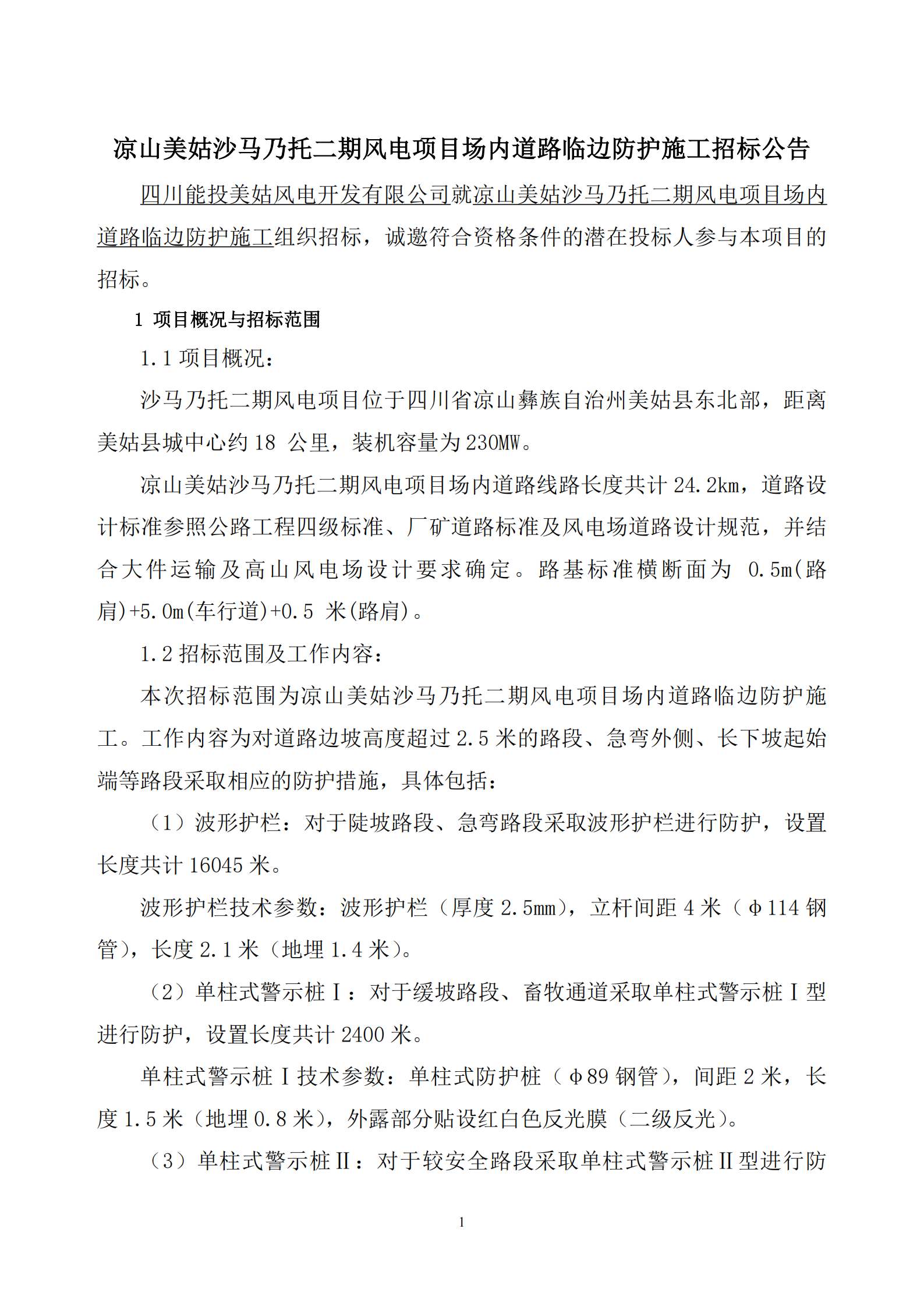 四川能投美姑风电开发有限公司就凉山美姑沙马乃托二期风电项目场内道路临边防护施工组织招标,诚邀符合资格条件的潜在投标人参与本项目的招标。