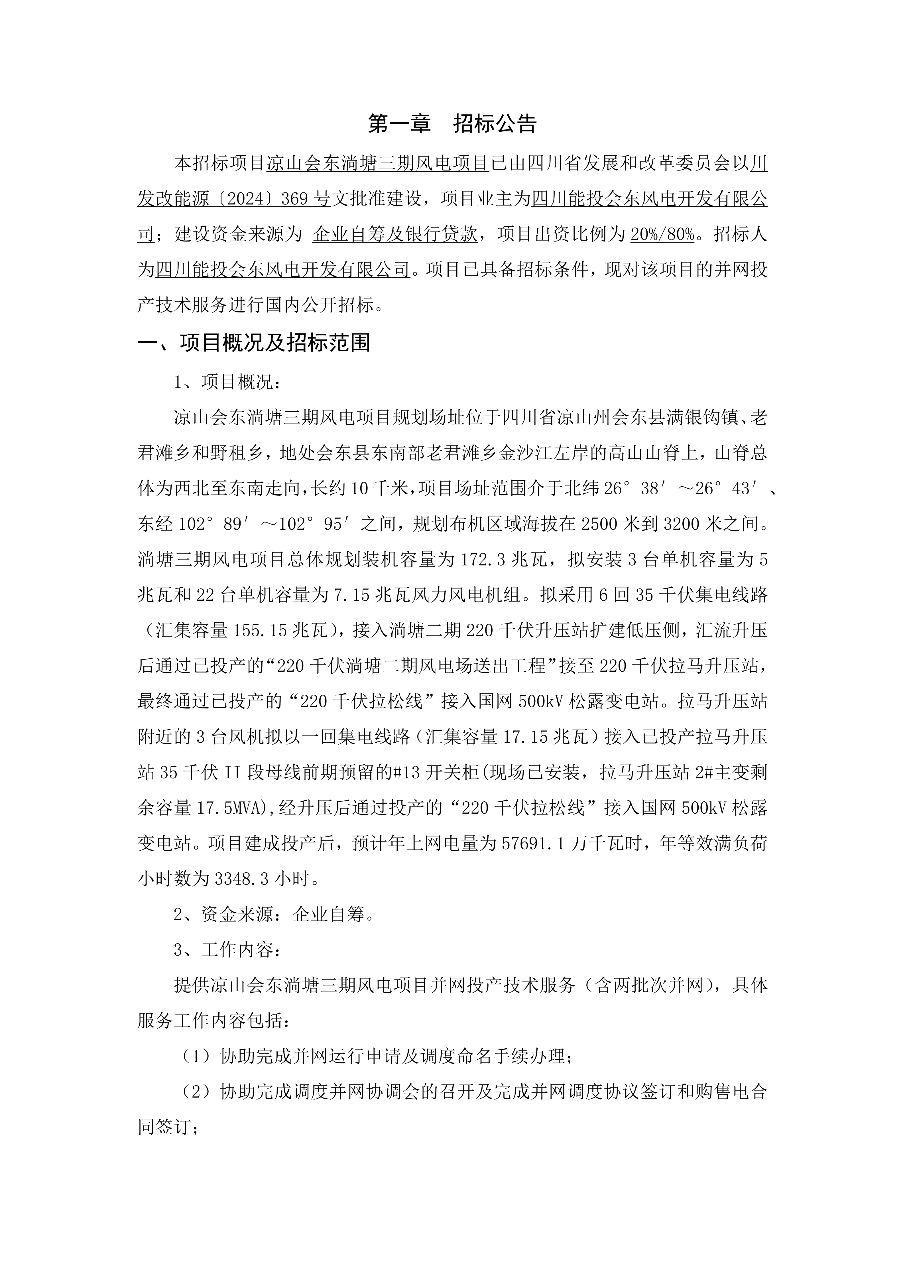 本招标项目凉山会东淌塘三期风电项目已由四川省发展和改革委员会以川发改能源〔2024〕369号文批准建设,项目业主为四川能投会东风电开发有限公司;建设资金来源为 企业自筹及银行贷款,项目出资比例为20%/80%。招标人为四川能投会东风电开发有限公司。项目已具备招标条件,现对该项目的并网投产技术服务进行国内公开招标。