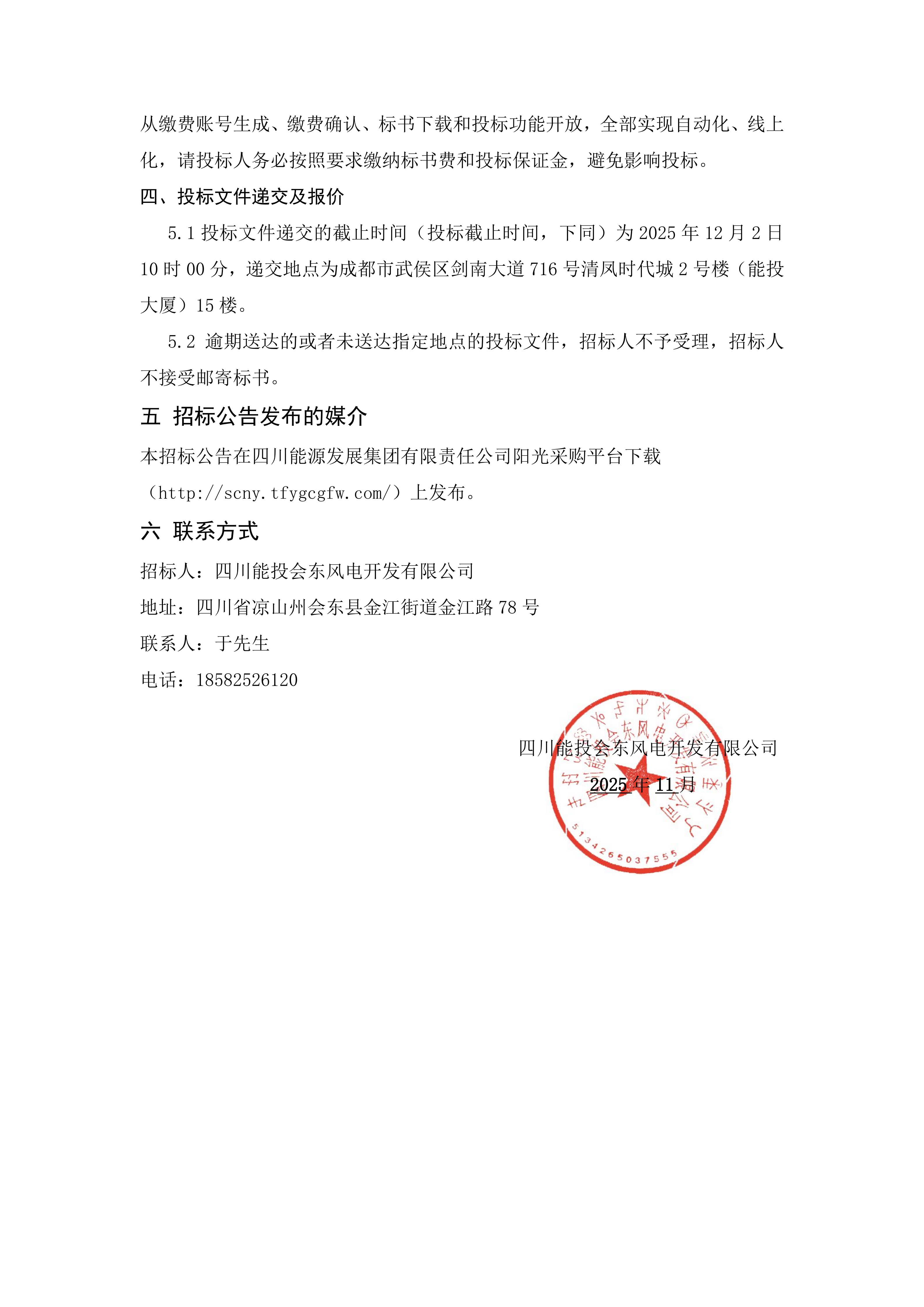 5.1投标文件递交的截止时间(投标截止时间,下同)为2025年12月2日10时00分,递交地点为成都市武侯区剑南大道716号清凤时代城2号楼(能投大厦)15楼。
