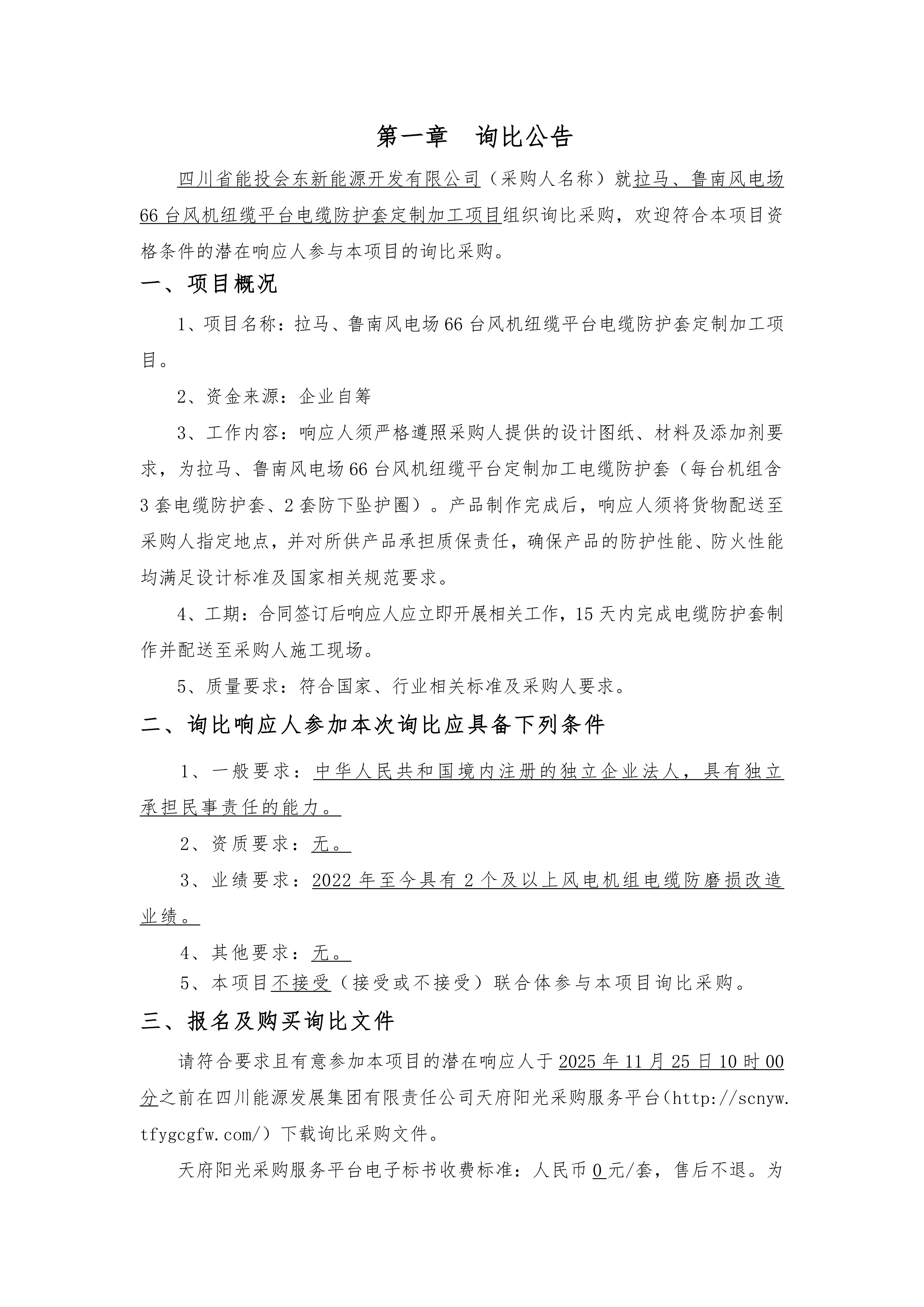 四川省能投会东新能源开发有限公司(采购人名称)就拉马、鲁南风电场66台风机纽缆平台电缆防护套定制加工项目组织询比采购,欢迎符合本项目资格条件的潜在响应人参与本项目的询比采购。