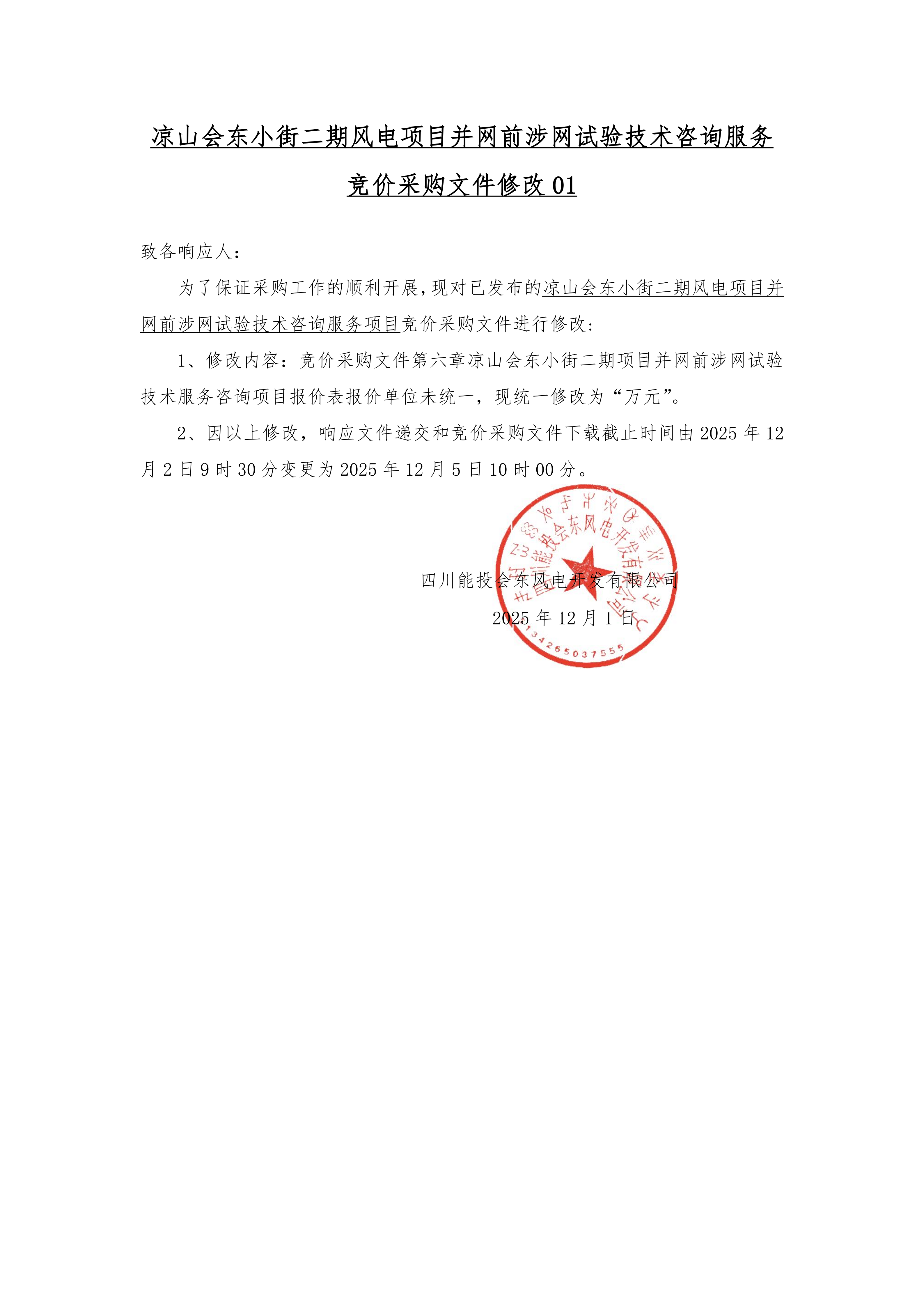 为了保证采购工作的顺利开展,现对已发布的凉山会东小街二期风电项目并网前涉网试验技术咨询服务项目竞价采购文件进行修改: