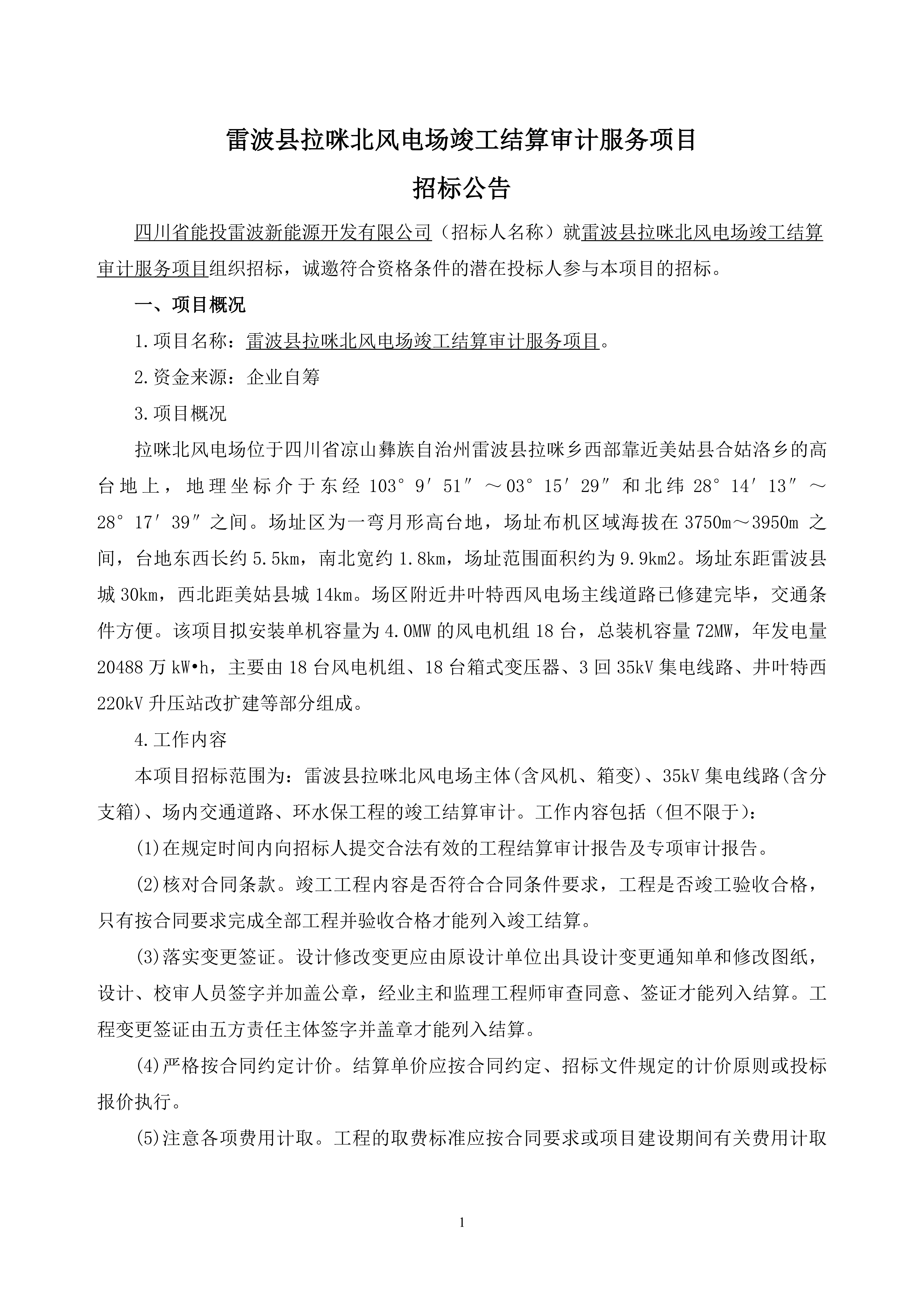 1.项目名称:雷波县拉咪北风电场竣工结算审计服务项目。