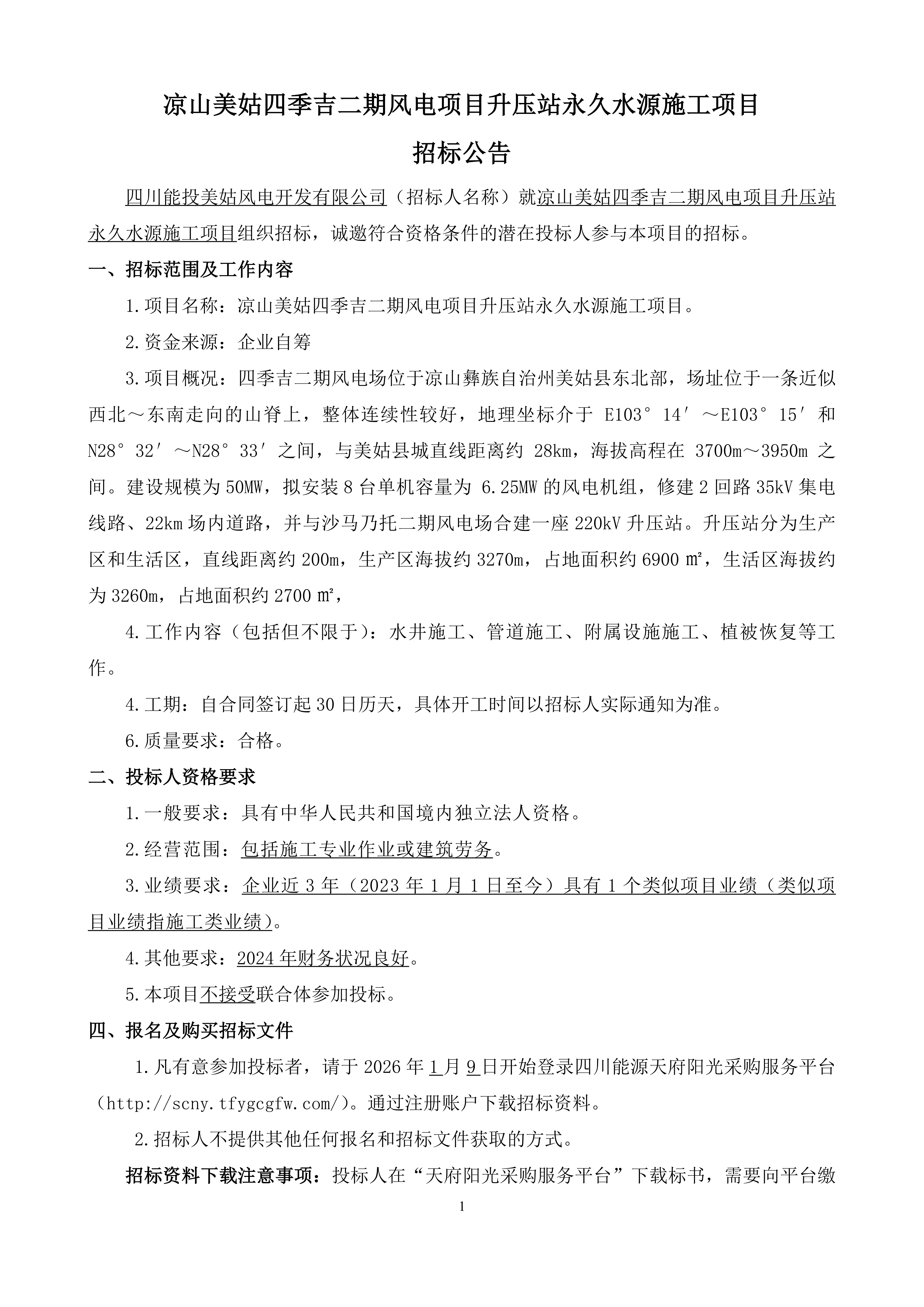四川能投美姑风电开发有限公司(招标人名称)就凉山美姑四季吉二期风电项目升压站永久水源施工项目组织招标,诚邀符合资格条件的潜在投标人参与本项目的招标。
