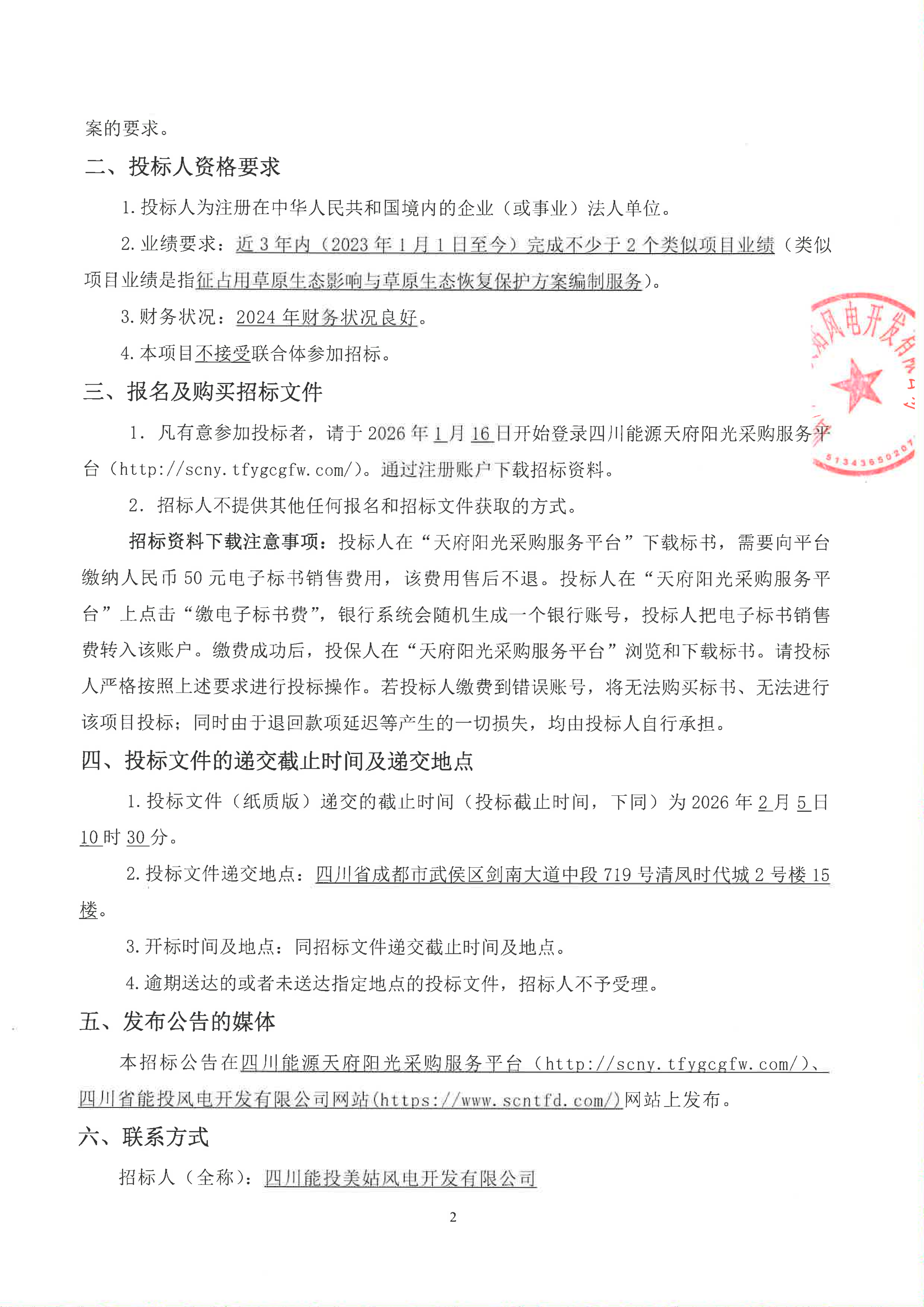 1.项目名称:四川能投美姑风电开发有限公司所属风电场新增征占用草原影响与草原生态恢复保护方案编制技术服务项目。