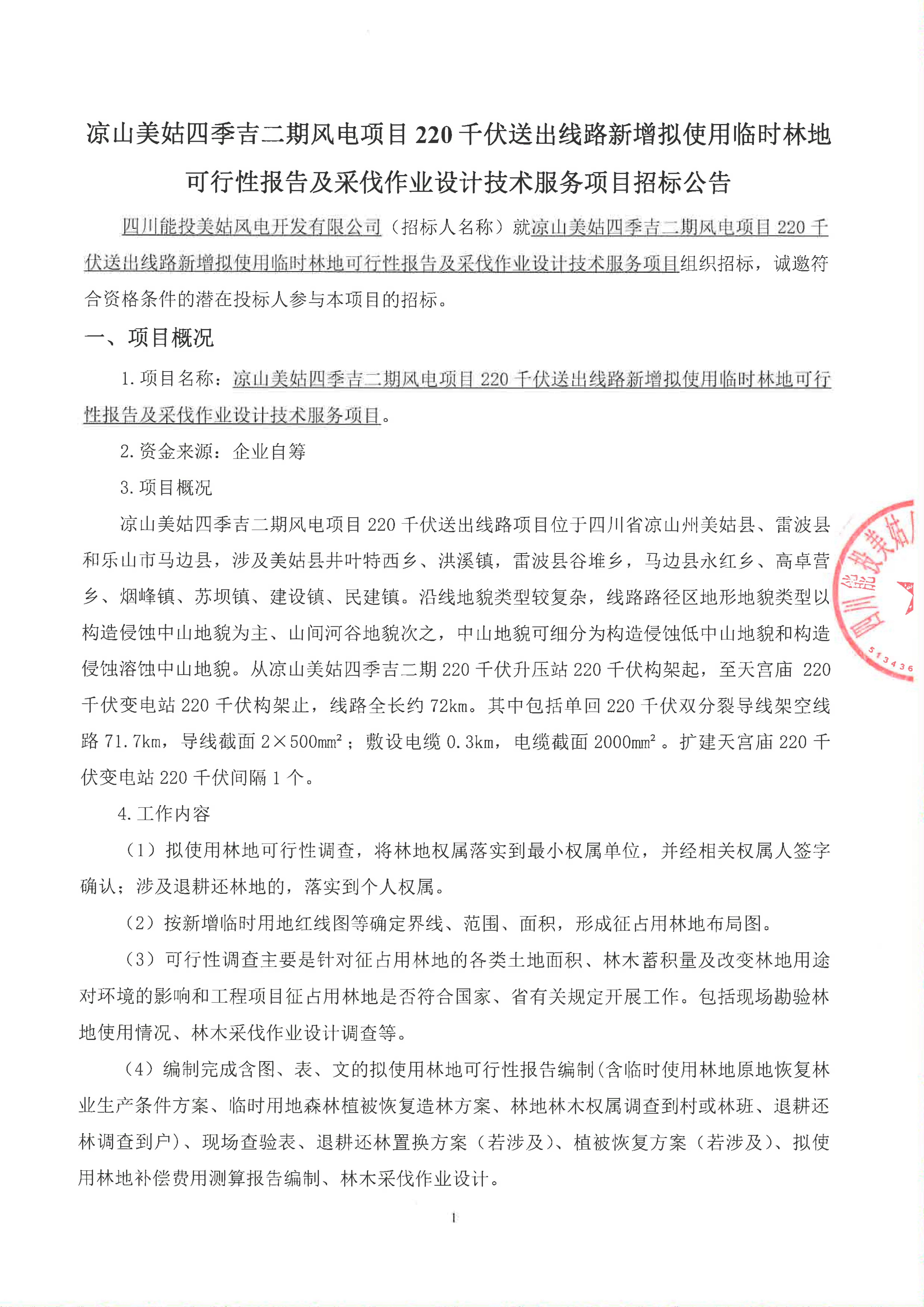 1.项目名称:凉山美姑四季吉二期风电项目220千伏送出线路新增拟使用临时林地可行性报告及采伐作业设计技术服务项目。