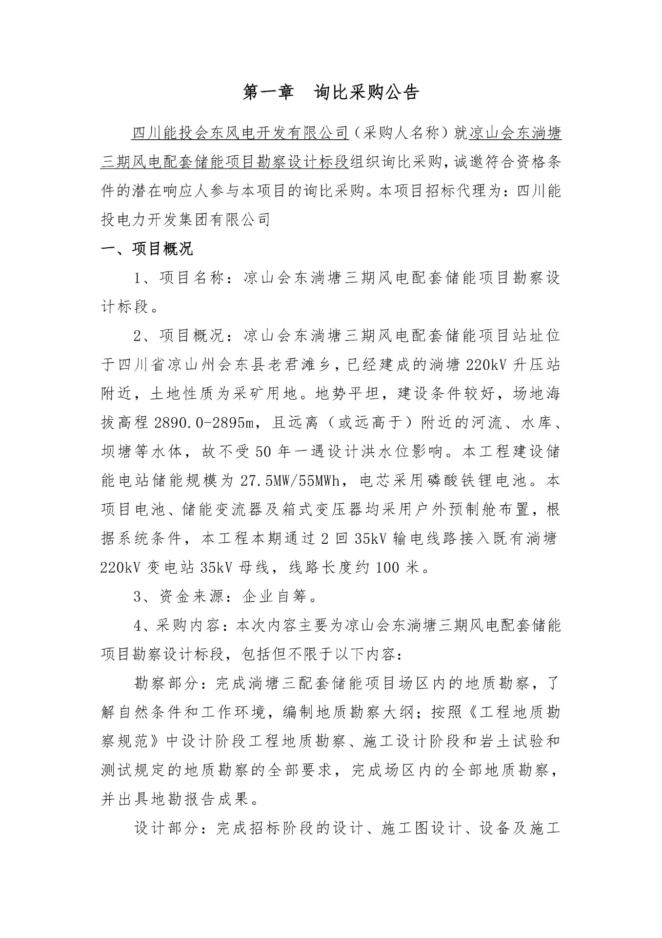 四川能投会东风电开发有限公司(采购人名称)就凉山会东淌塘三期风电配套储能项目勘察设计标段组织询比采购,诚邀符合资格条件的潜在响应人参与本项目的询比采购。本项目招标代理为:四川能投电力开发集团有限公司