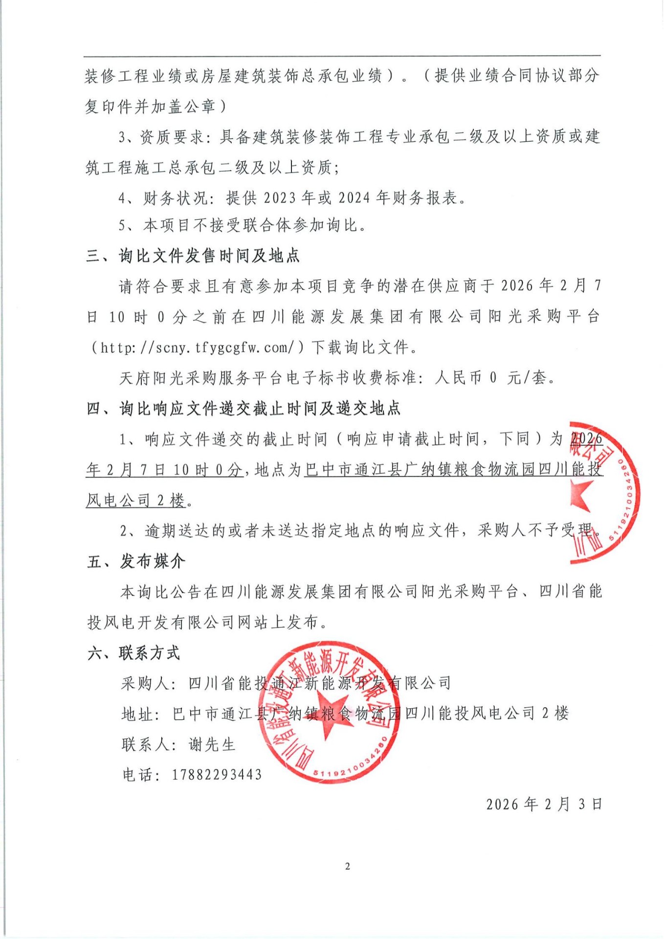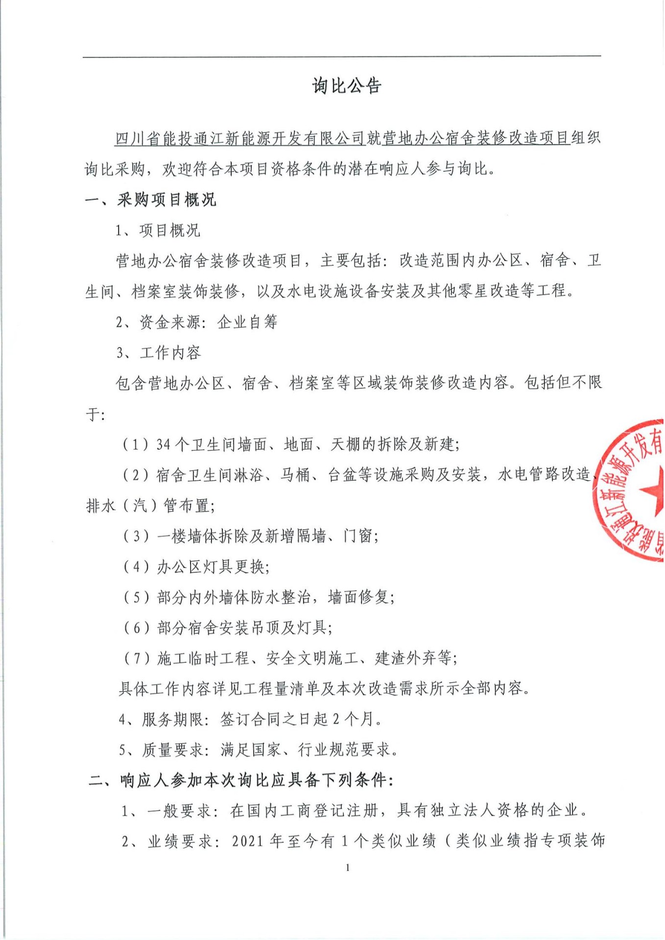 四川省能投通江新能源开发有限公司就营地办公宿舍装修改造项目组织询比采购,欢迎符合本项目资格条件的潜在响应人参与询比。
