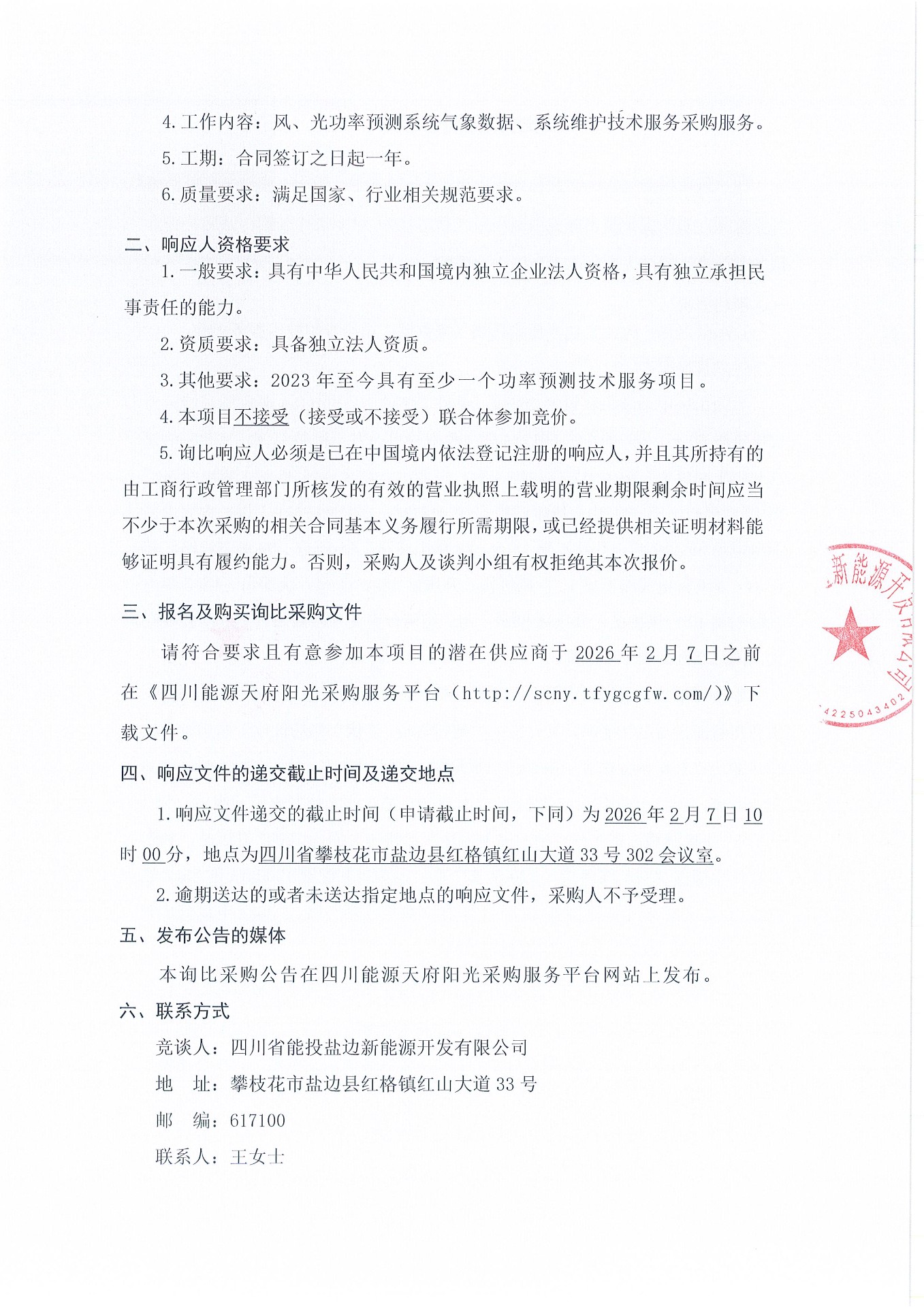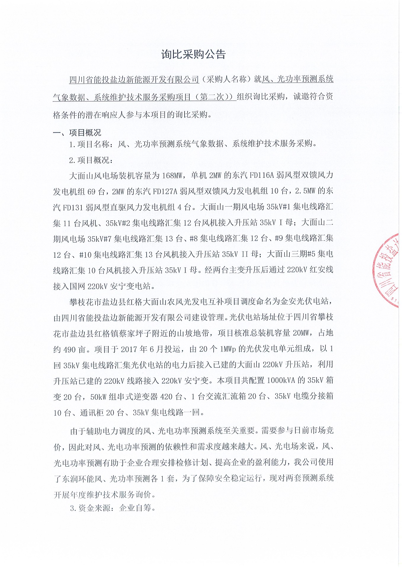 四川省能投盐边新能源开发有限公司关于风、光功率预测系统气象数据、系统维护技术服务采购项目(第二次)的询比采购公告