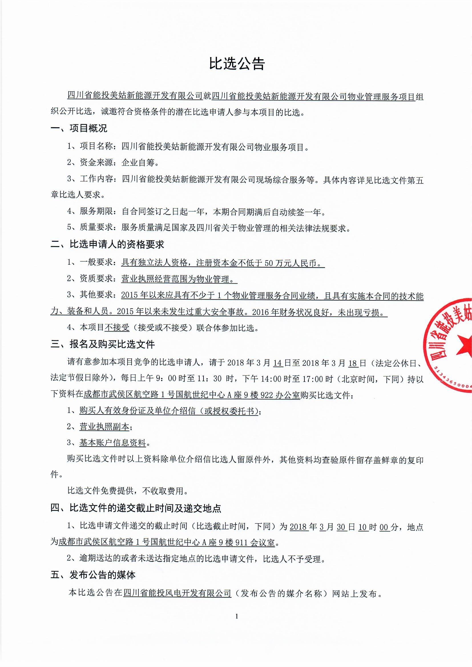四川省能投美姑新能源开发有限公司就四川省能投美姑新能源开发有限公司物业管理服务项目组织公开比选,诚邀符合资格条件的潜在比选申请人参与本项目的比选。