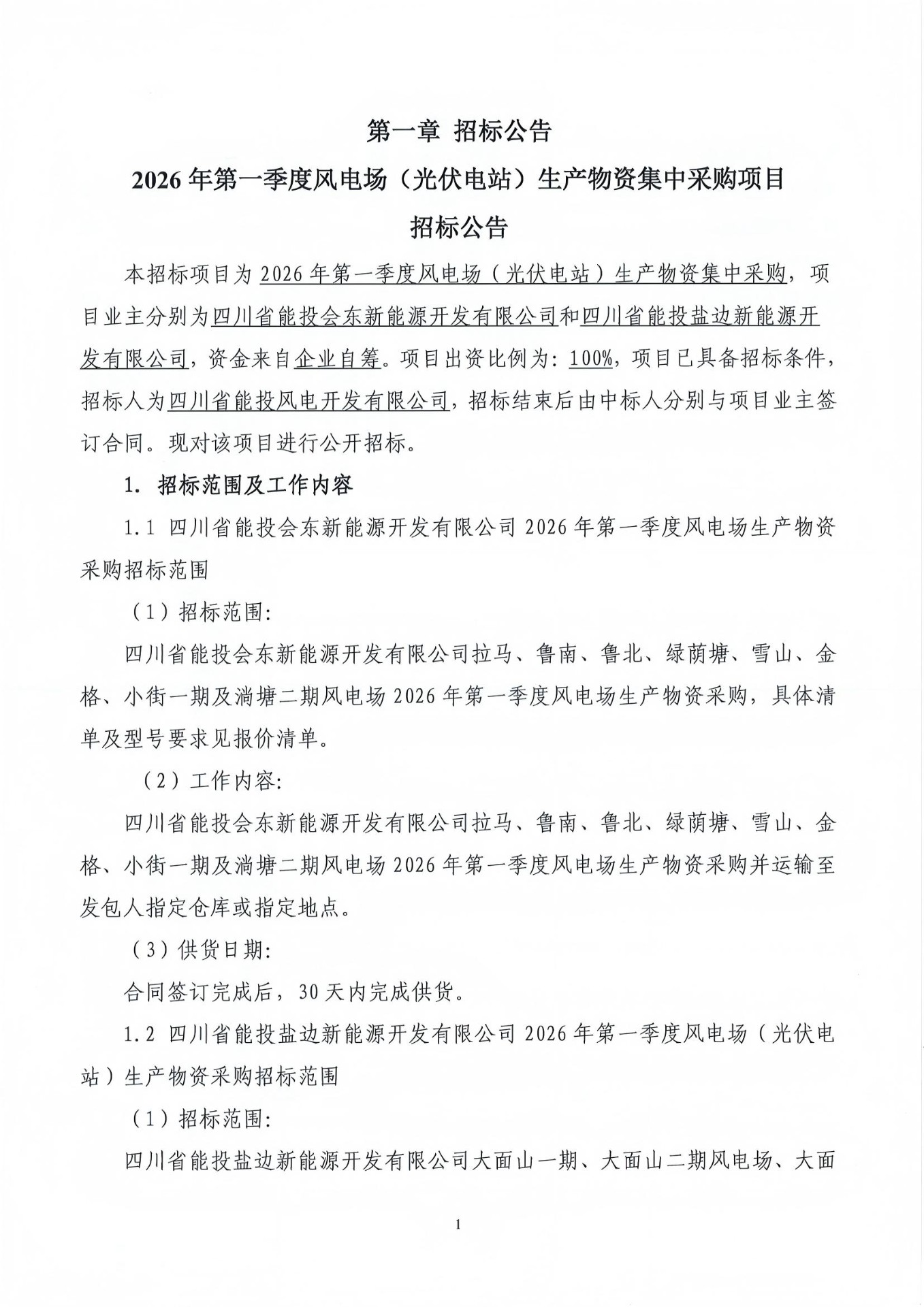 本招标项目为2026年第一季度风电场(光伏电站)生产物资集中采购,项