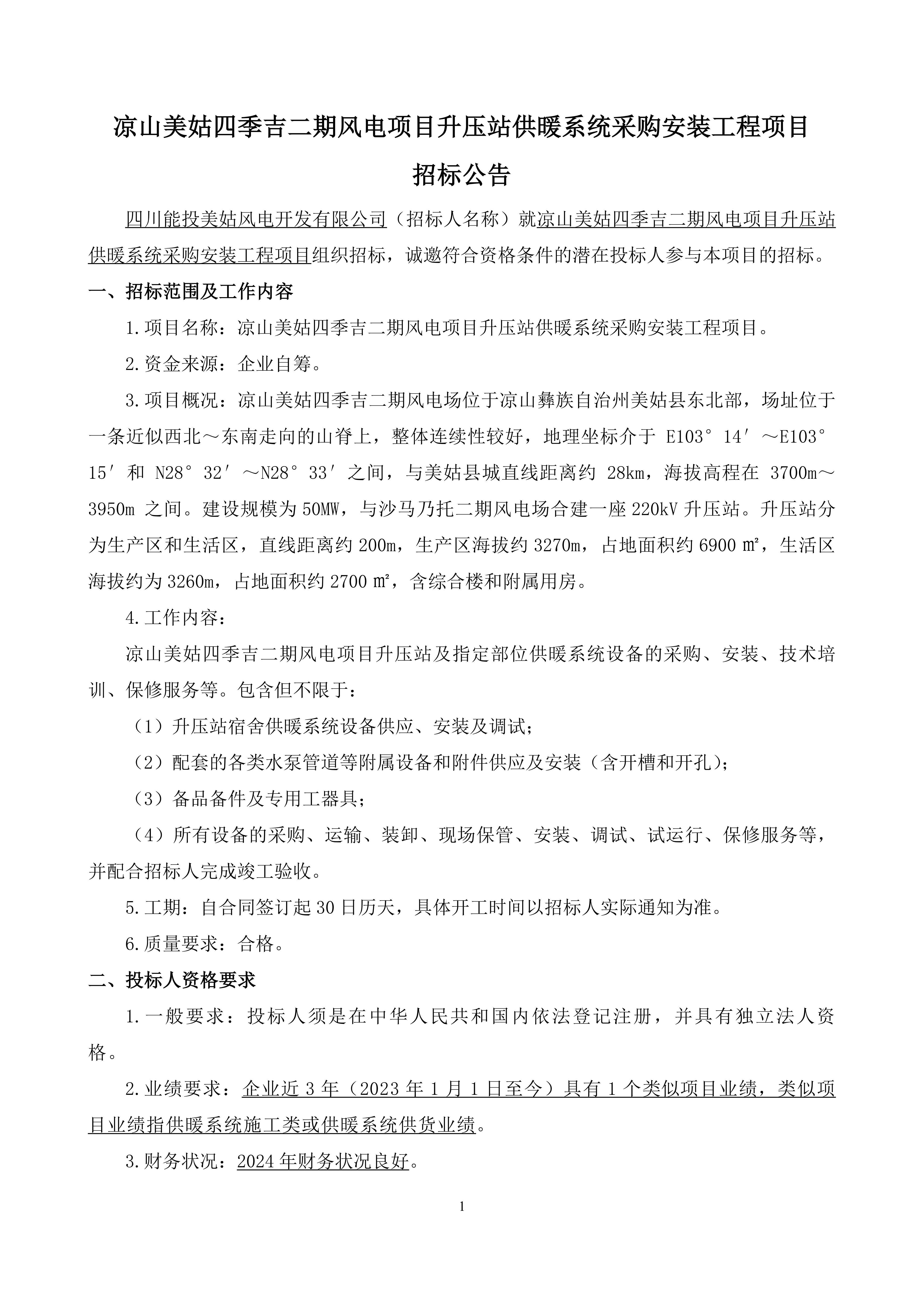 四川能投美姑风电开发有限公司(招标人名称)就凉山美姑四季吉二期风电项目升压站供暖系统采购安装工程项目组织招标,诚邀符合资格条件的潜在投标人参与本项目的招标。