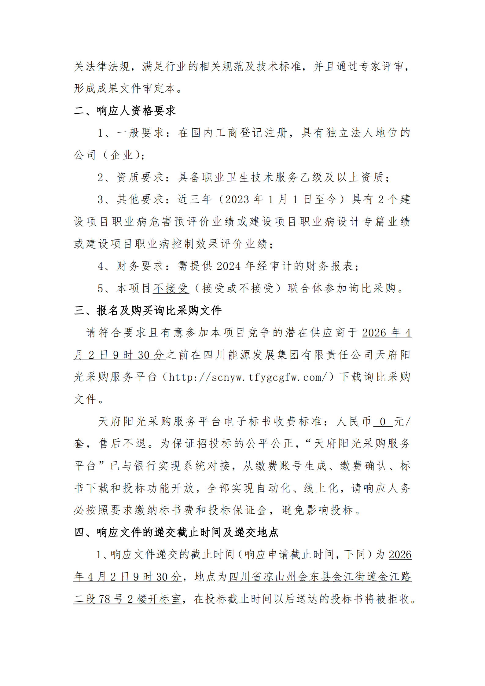 四川能投会东风电开发有限公司(采购人名称)就凉山会东淌塘三期风电配套储能项目和凉山会东堵格二期、小街二期风电配套储能项目职业病危害预评价、设计专篇、控制效果评价报告编制项目组织询比采购,诚邀符合资格条件的潜在响应人参与本项目的询比采购。