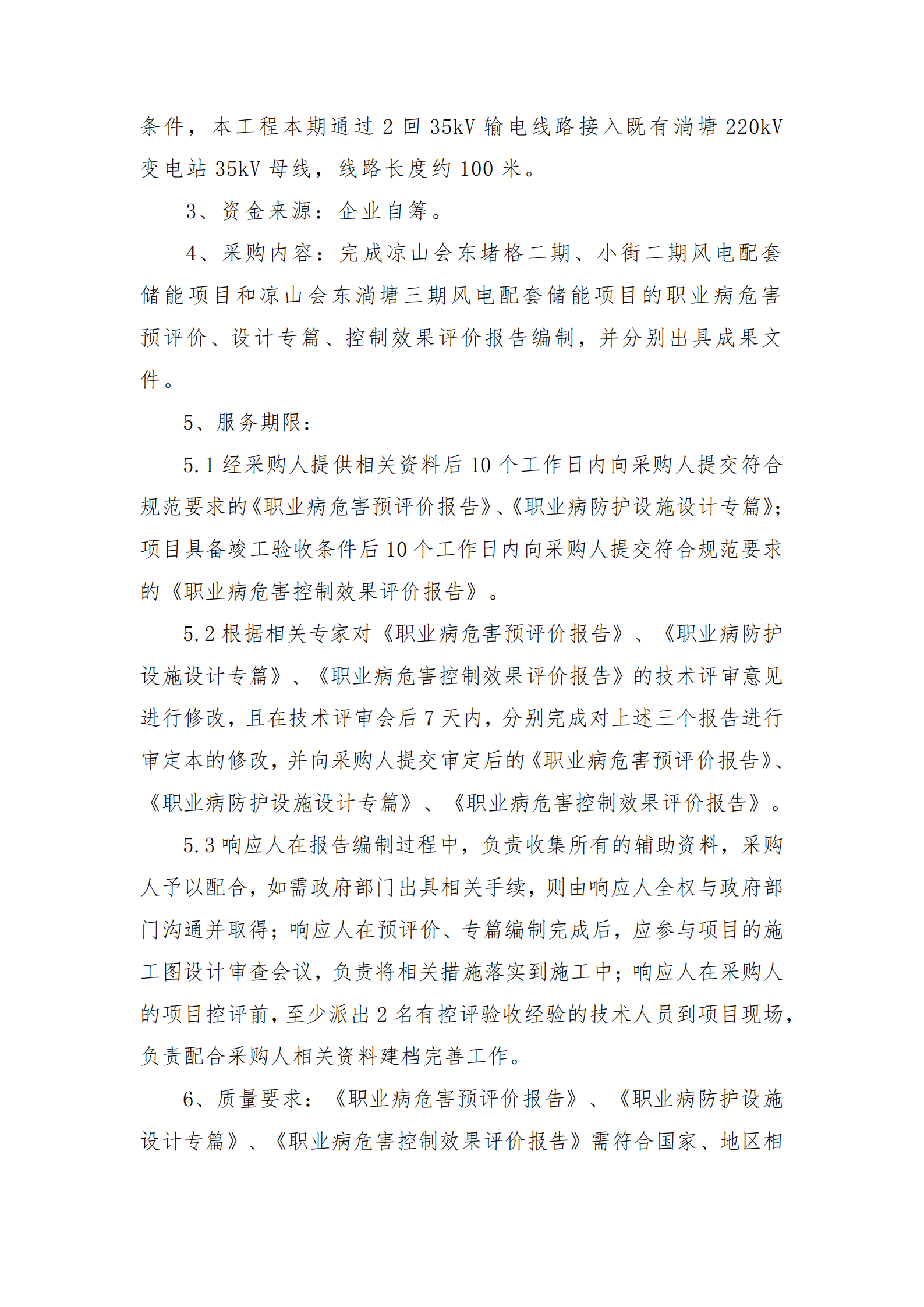 4、采购内容:完成凉山会东堵格二期、小街二期风电配套储能项目和凉山会东淌塘三期风电配套储能项目的职业病危害预评价、设计专篇、控制效果评价报告编制,并分别出具成果文件。