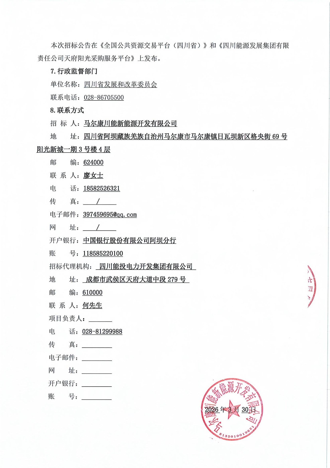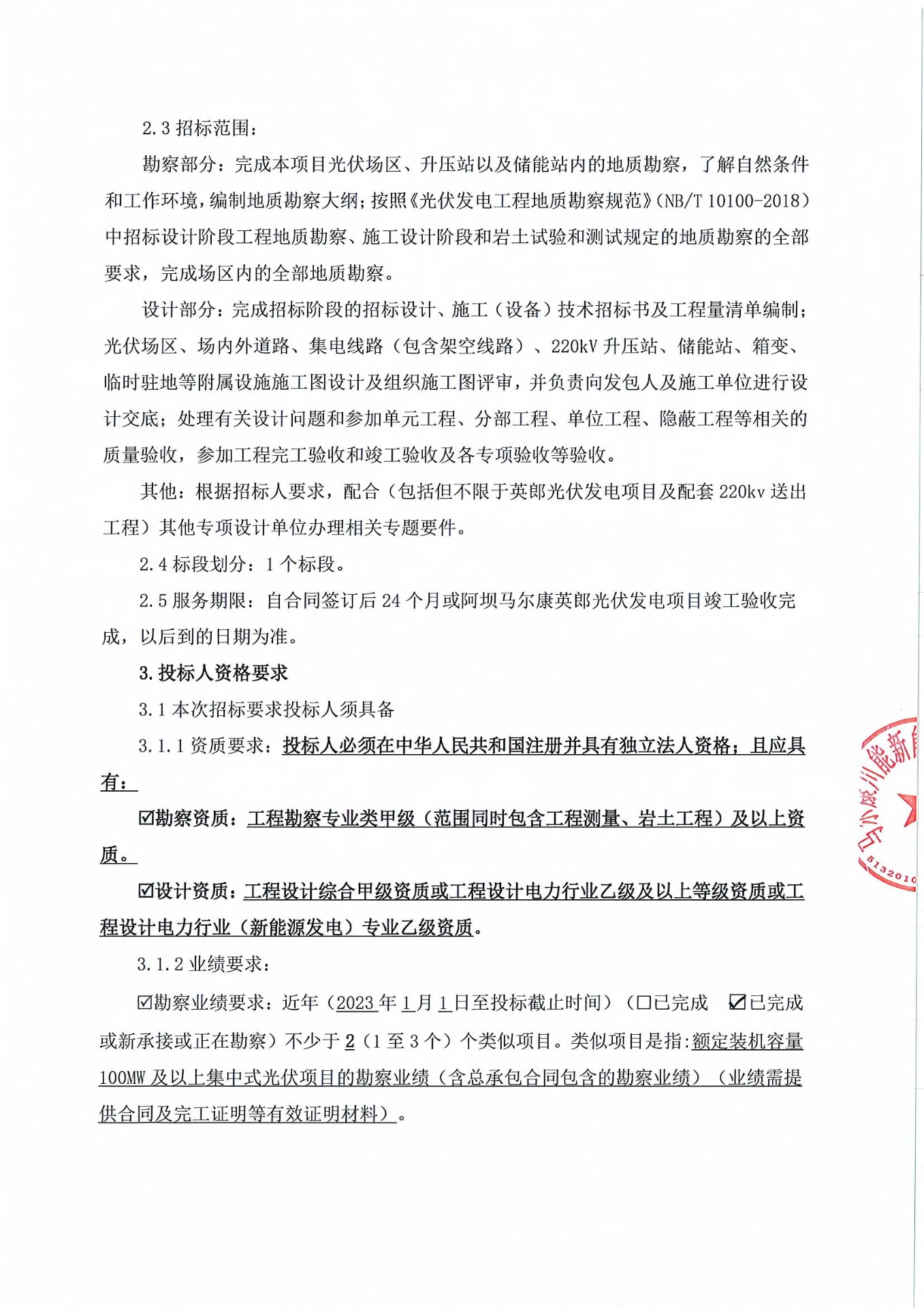 1.1本招标项目阿坝马尔康英郎光伏发电项目(项目名称)已由四川省发展和改革委员会以川投资备【2508-510000-04-01-298287】FGQB-1431号批准建设,项目业主为马尔康川能新能源开发有限公司,建设资金来自企业自筹及银行贷款,项目出资比例为企业自筹20%/银行贷款80%,招标人为马尔康川能新能源开发有限公司。项目已具备招标条件,现对该项目的勘察设计进行公开招标。