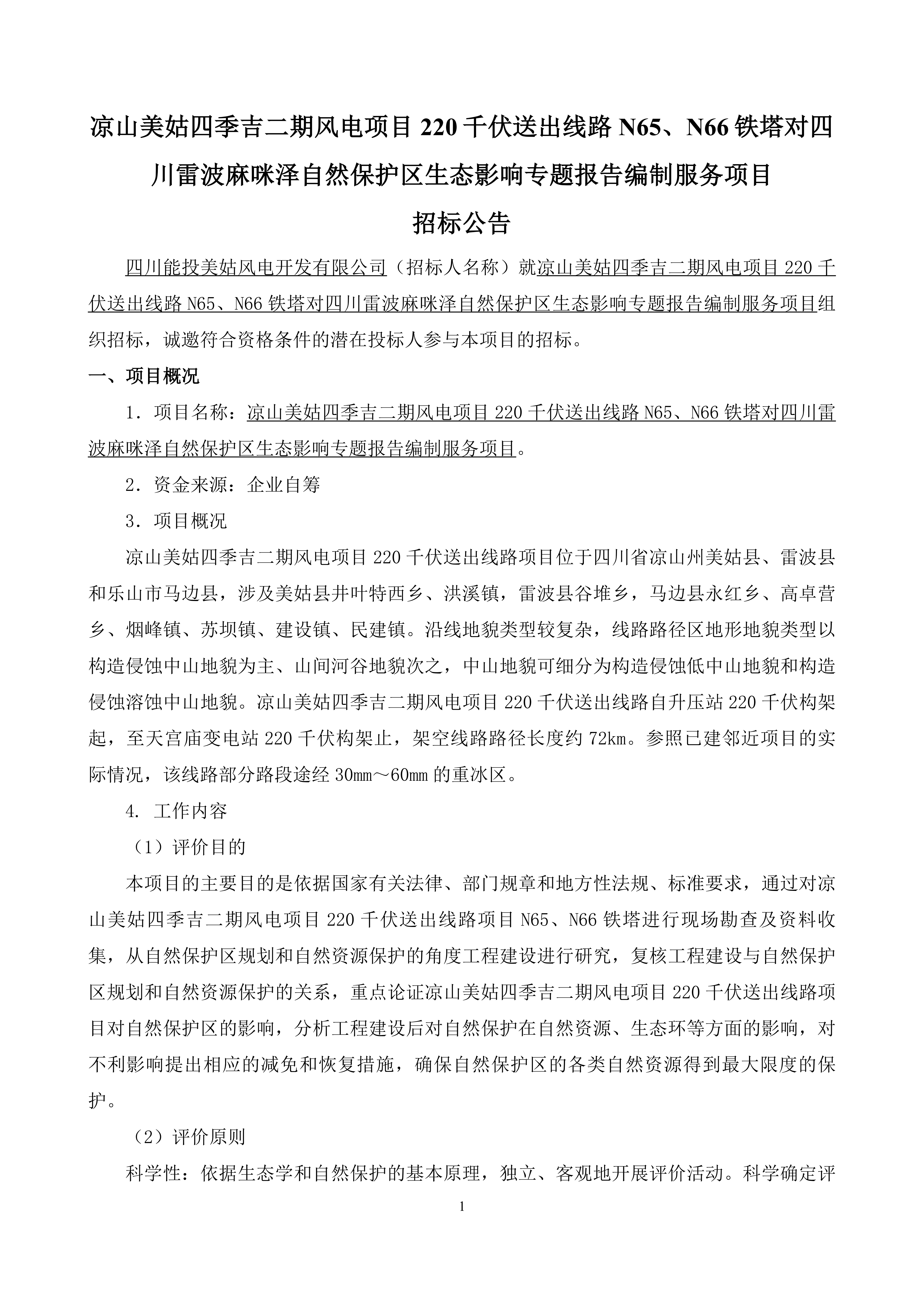 四川能投美姑风电开发有限公司(招标人名称)就凉山美姑四季吉二期风电项目220千伏送出线路N65、N66铁塔对四川雷波麻咪泽自然保护区生态影响专题报告编制服务项目组织招标,诚邀符合资格条件的潜在投标人参与本项目的招标。