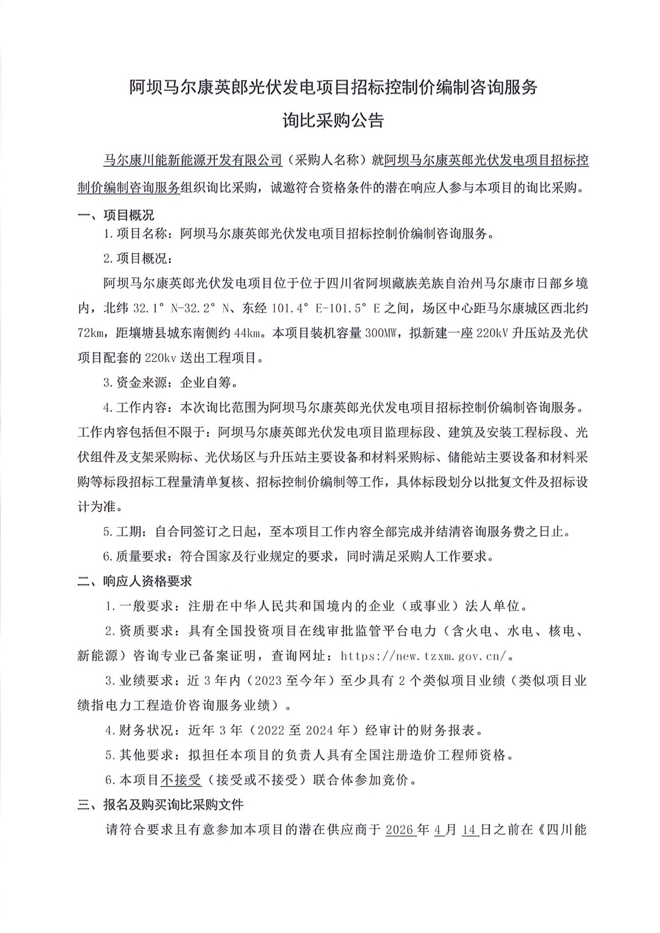 马尔康川能新能源开发有限公司(采购人名称)就阿坝马尔康英郎光伏发电项目招标控制价编制咨询服务组织询比采购,诚邀符合资格条件的潜在响应人参与本项目的询比采购。
