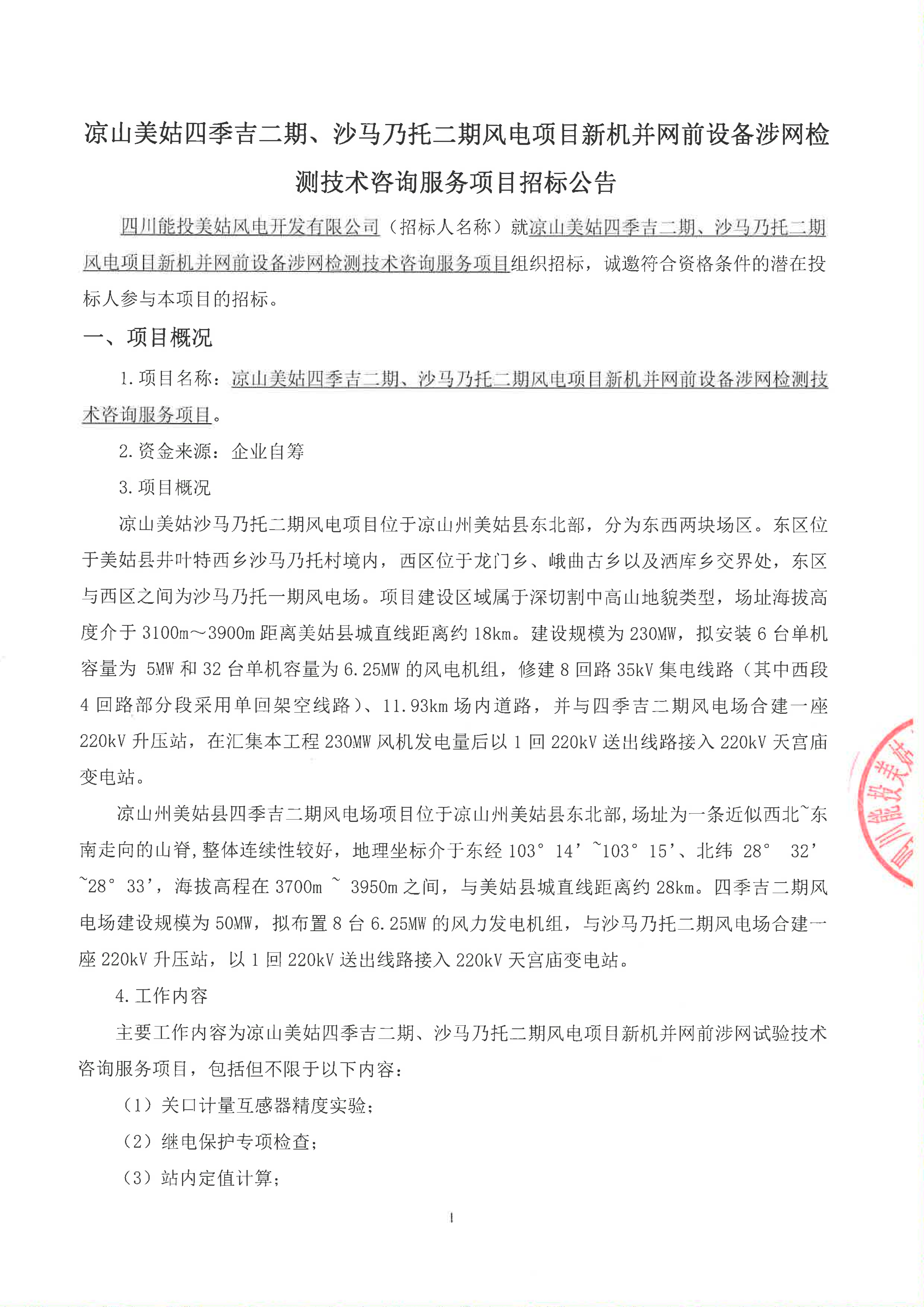 1.项目名称:凉山美姑四季吉二期、沙马乃托二期风电项目新机并网前设备涉网检测技术咨询服务项目。