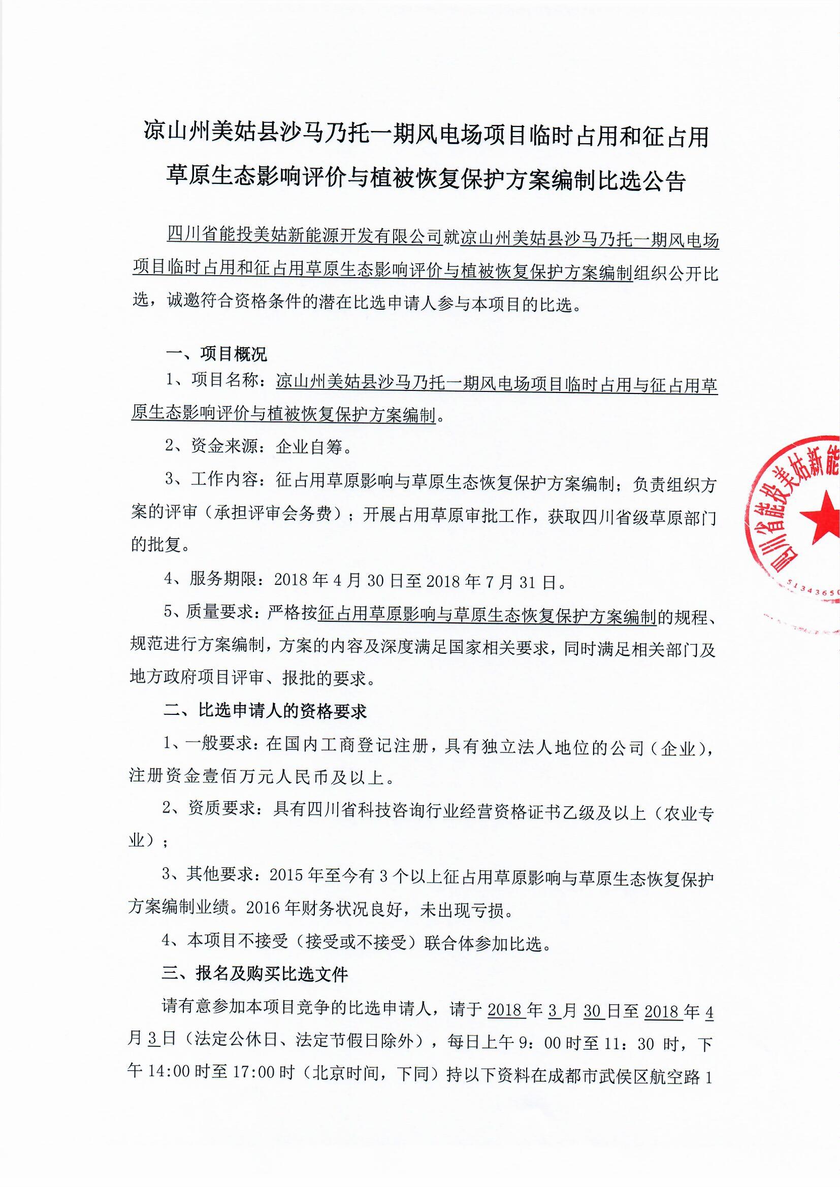 四川省能投美姑新能源开发有限公司就凉山州美姑县沙马乃托一期风电场项目临时占用和征占用草原生态影响评价与植被恢复保护方案编制组织公开比选,诚邀符合资格条件的潜在比选申请人参与本项目的比选。