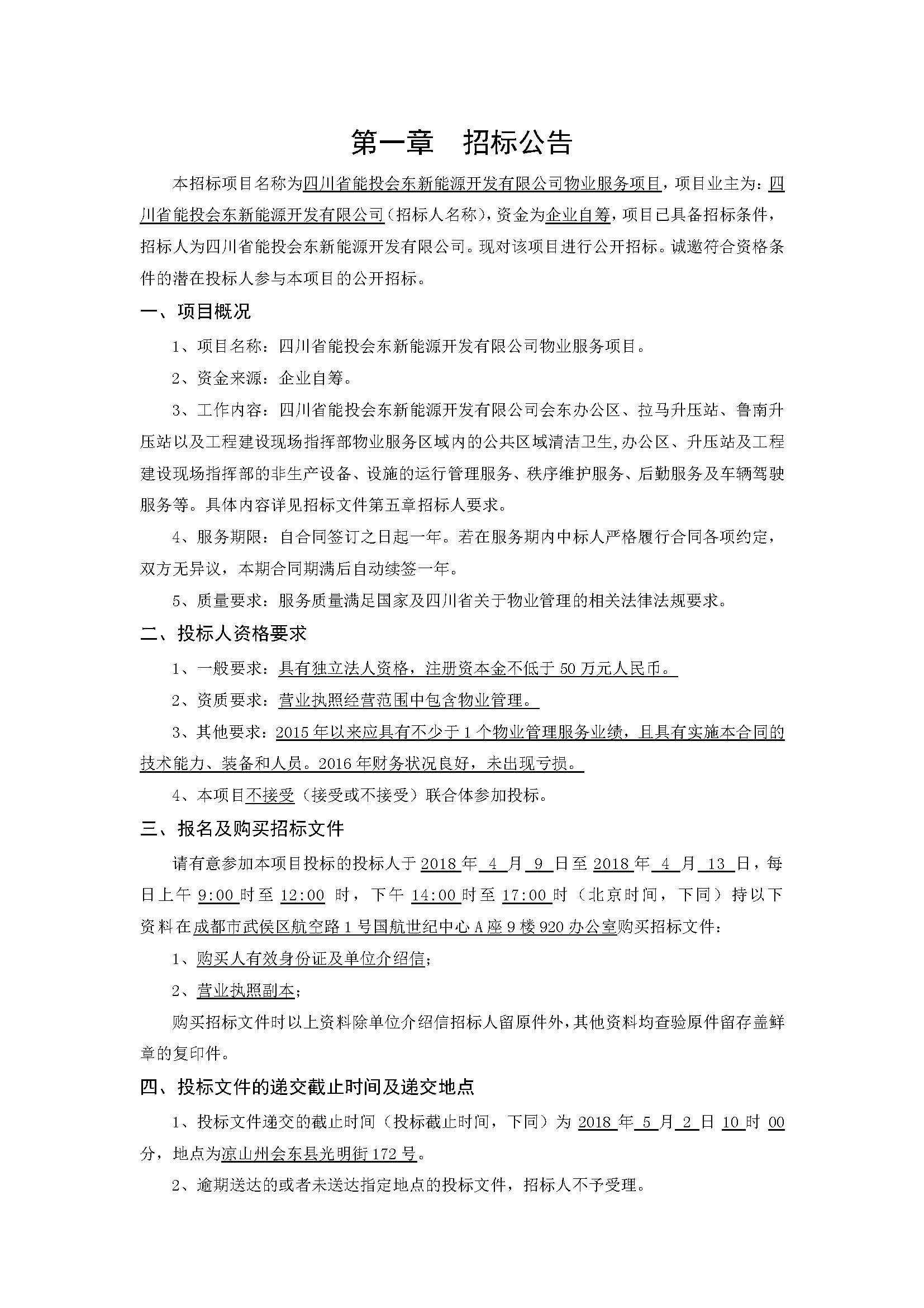 本招标项目名称为四川省能投会东新能源开发有限公司物业服务项目,项目业主为:四川省能投会东新能源开发有限公司(招标人名称),资金为企业自筹,项目已具备招标条件,招标人为四川省能投会东新能源开发有限公司。现对该项目进行公开招标。诚邀符合资格条件的潜在投标人参与本项目的公开招标。