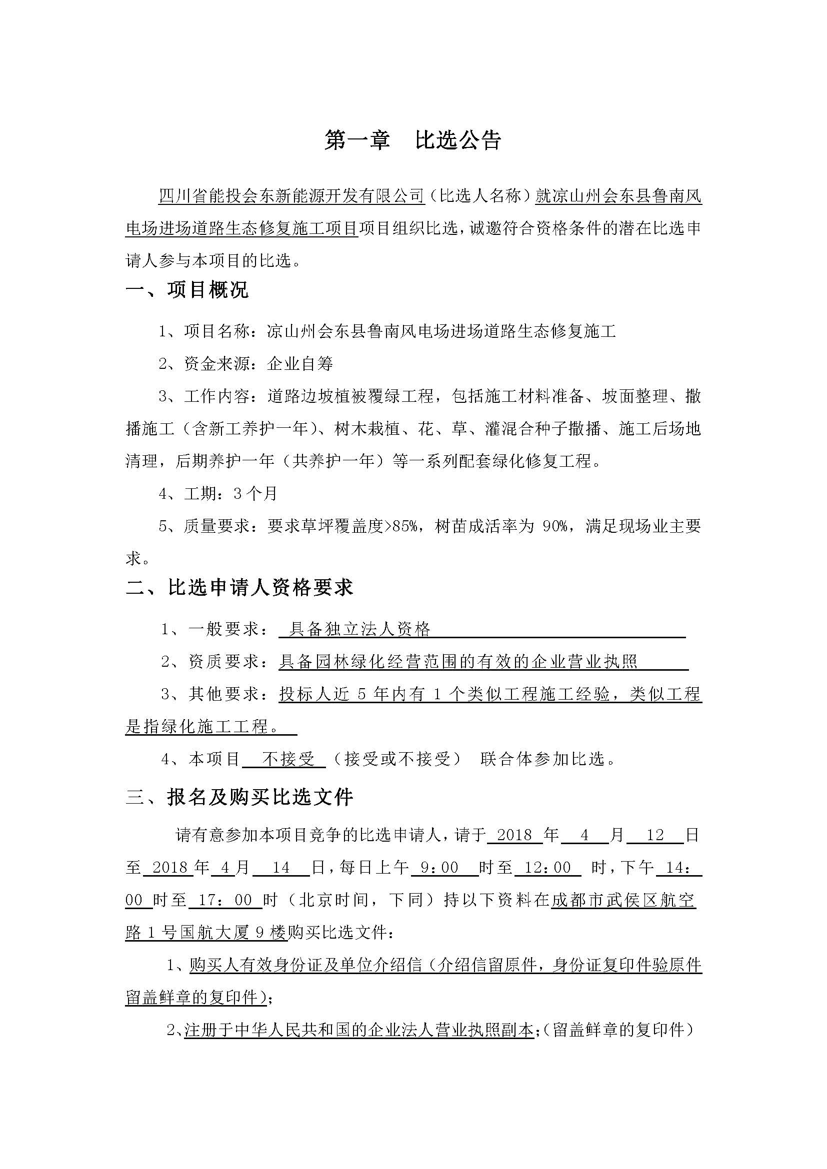 四川省能投会东新能源开发有限公司(比选人名称)就凉山州会东县鲁南风电场进场道路生态修复施工项目项目组织比选,诚邀符合资格条件的潜在比选申请人参与本项目的比选。