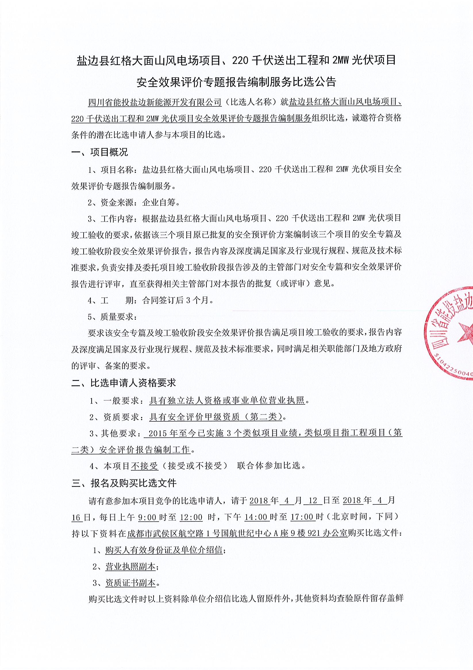 四川省能投盐边新能源开发有限公司(比选人名称)就盐边县红格大面山风电场项目、220千伏送出工程和2MW光伏项目安全效果评价专题报告编制服务组织比选,诚邀符合资格条件的潜在比选申请人参与本项目的比选。
