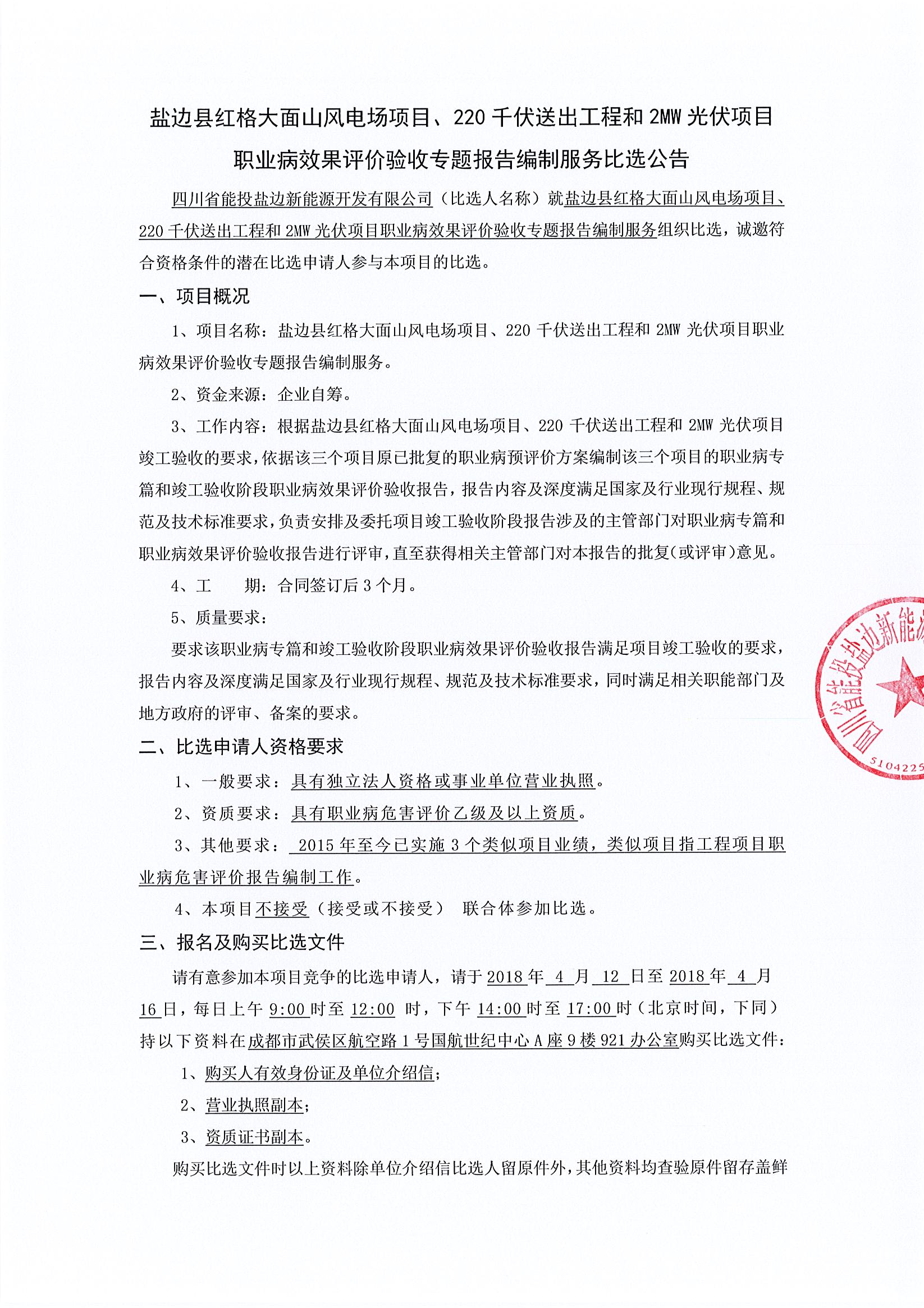 1、项目名称:盐边县红格大面山风电场项目、220千伏送出工程和2MW光伏项目职业病效果评价验收专题报告编制服务。
